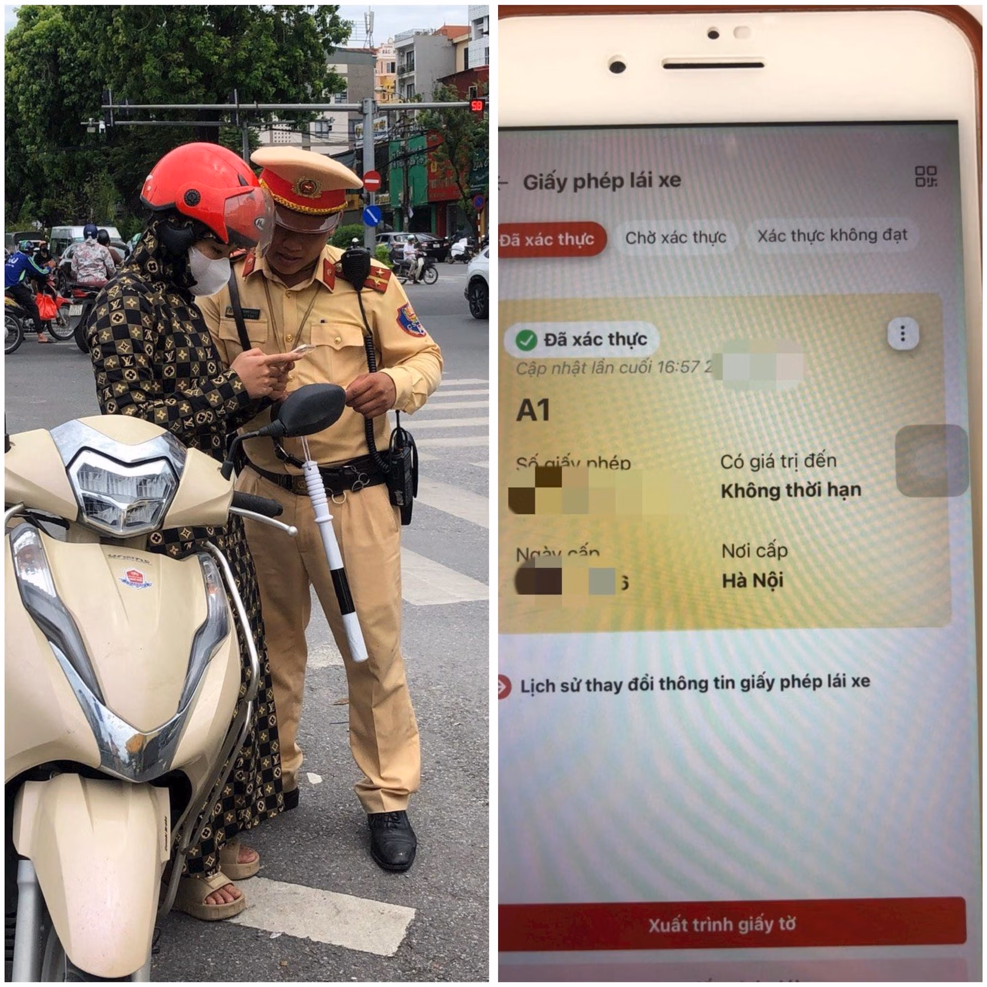 Người điều khiển phương tiện là chị B.T.H. (SN 1997, trú tại quận Tây Hồ, Hà Nội) xuất trình đăng ký xe, giấy phép lái xe hạng A1 trên ứng dụng VNeID.