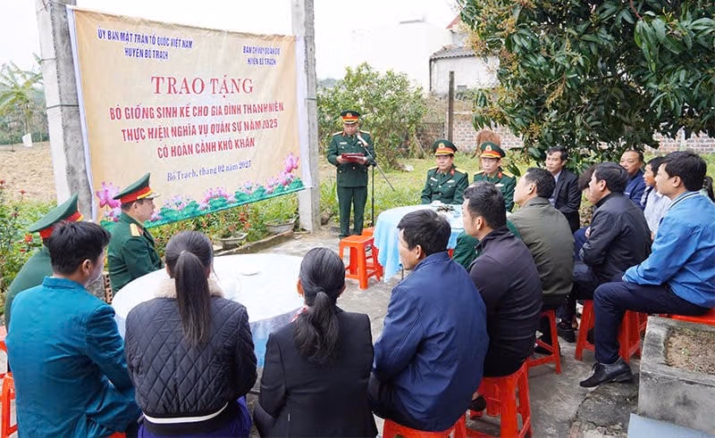 Ngày 12/2, ông Nguyễn Văn Lam, Phó Chủ tịch Ủy ban MTTQ huyện Bố Trạch (Quảng Bình) cho biết: Góp phần giúp đỡ cho các gia đình thanh niên có hoàn cảnh khó khăn thực hiện nghĩa vụ quân sự năm 2025 trên địa bàn, Mặt trận huyện phối hợp với Ban chỉ huy Quân sự huyện tổ chức trao tặng 10 con bò giống sinh kế.