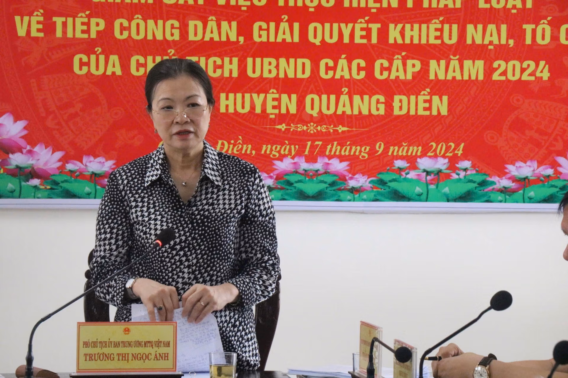 Ngày 17/9, Đoàn giám sát của UBTƯ MTTQ Việt Nam do Phó Chủ tịch Trương Thị Ngọc Ánh làm trưởng đoàn đã có buổi làm việc tại huyện Quảng Điền (tỉnh Thừa Thiên Huế) về việc triển khai thực hiện pháp luật tiếp công dân, giải quyết khiếu nại, tố cáo của chủ tịch UBND các cấp.