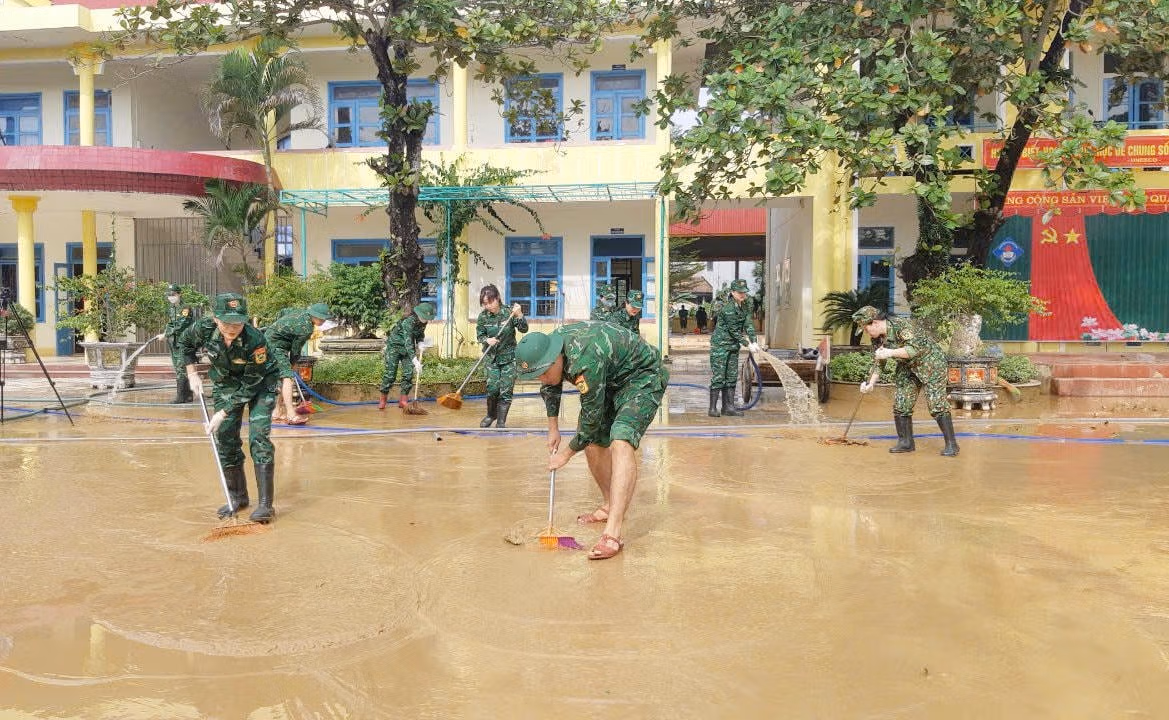 Cùng giúp nhân dân khắc phục lũ lụt, những ngày này, các lực lượng vũ trang, công an, thanh niên, phụ nữ ở tỉnh Quảng Bình đã xung kích, tích cực hỗ trợ người dân và các trường học dọn dẹp, vệ sinh.