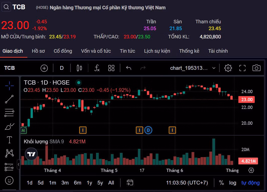 Trên thị trường chứng khoán, chốt phiên giao dịch ngày 27/6, cổ phiếu TCB đang ở mức 23.450 đồng/cổ phiếu, tăng 4,4% trong vòng 3 tháng trở lại đây.