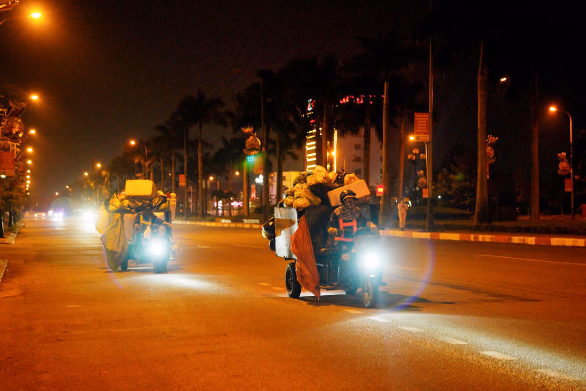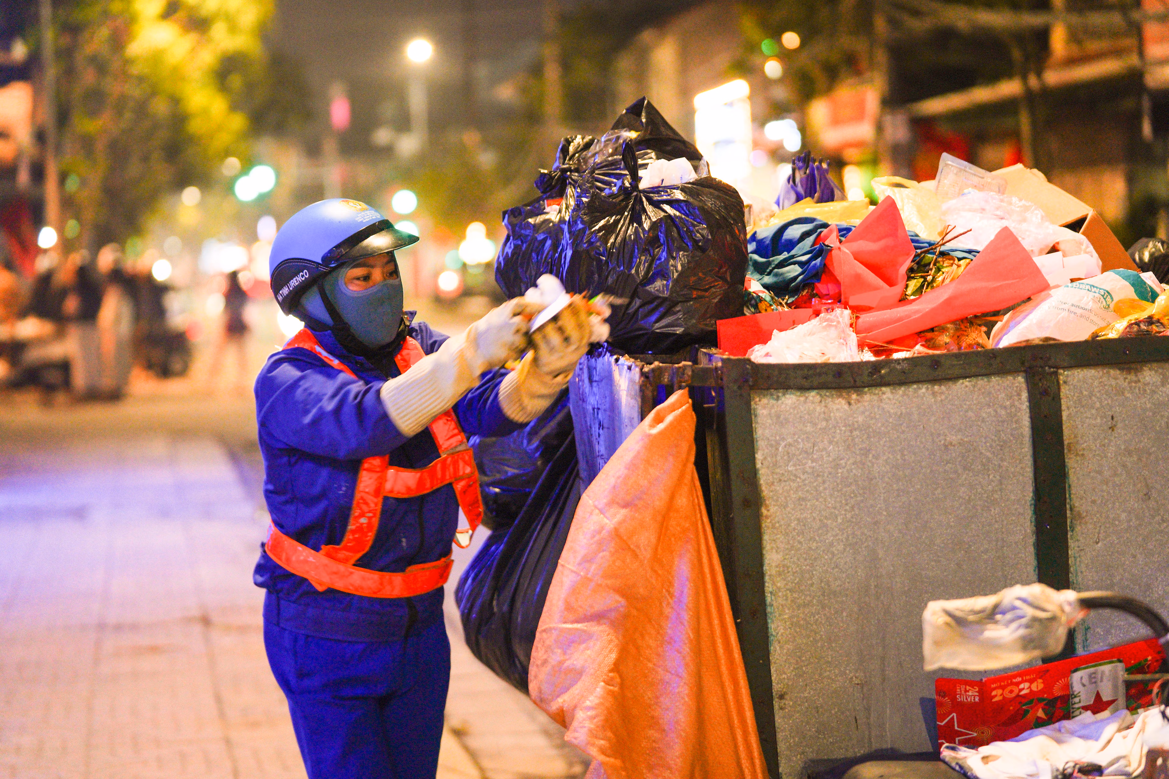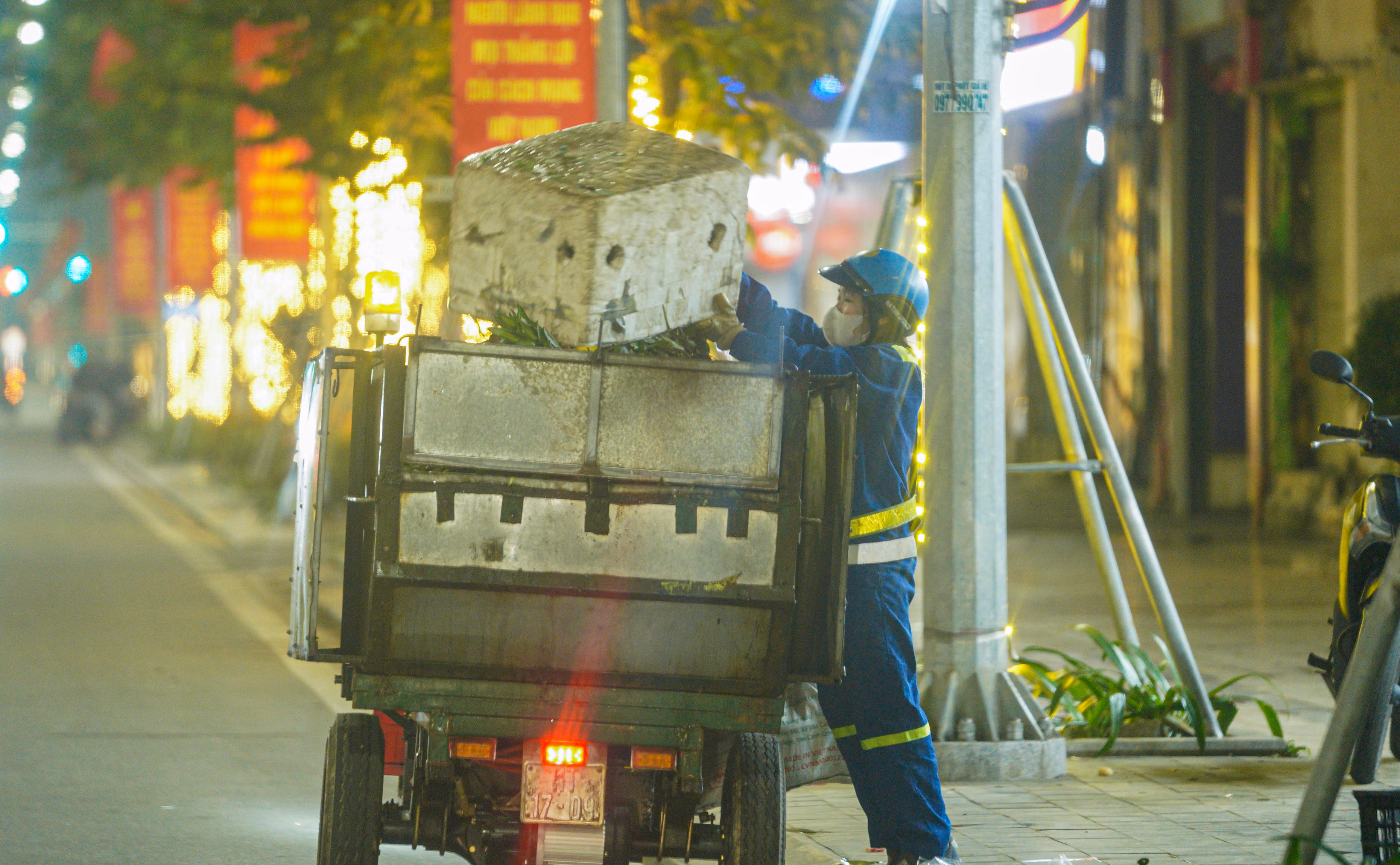 Chiều 30 Tết, khi nhiều gia đình còn tất bật chuẩn bị mâm cỗ, tổ công nhân của chị Đậu Thương đã bắt đầu ca trực. Những điểm bán hoa hoàn trả mặt bằng để lại cành đào, lá quất, thùng xốp, bao bì ni lông chất thành từng đống. Nhiệm vụ của họ là thu gom toàn bộ trước thời khắc chuyển giao năm cũ – năm mới.