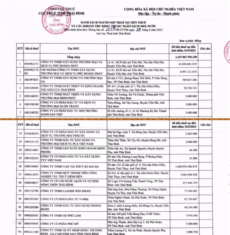 Trước đó, như Đại Đoàn Kết Online đã thông tin, vào ngày 28/6, Cục Thuế tỉnh Thái Bình ra Thông báo “về việc công khai người nộp thuế nợ thuế và các khoản thu khác thuộc ngân sách nhà nước”, tính đến ngày 31/5/2023, do Văn phòng Cục Thuế tỉnh quản lý.