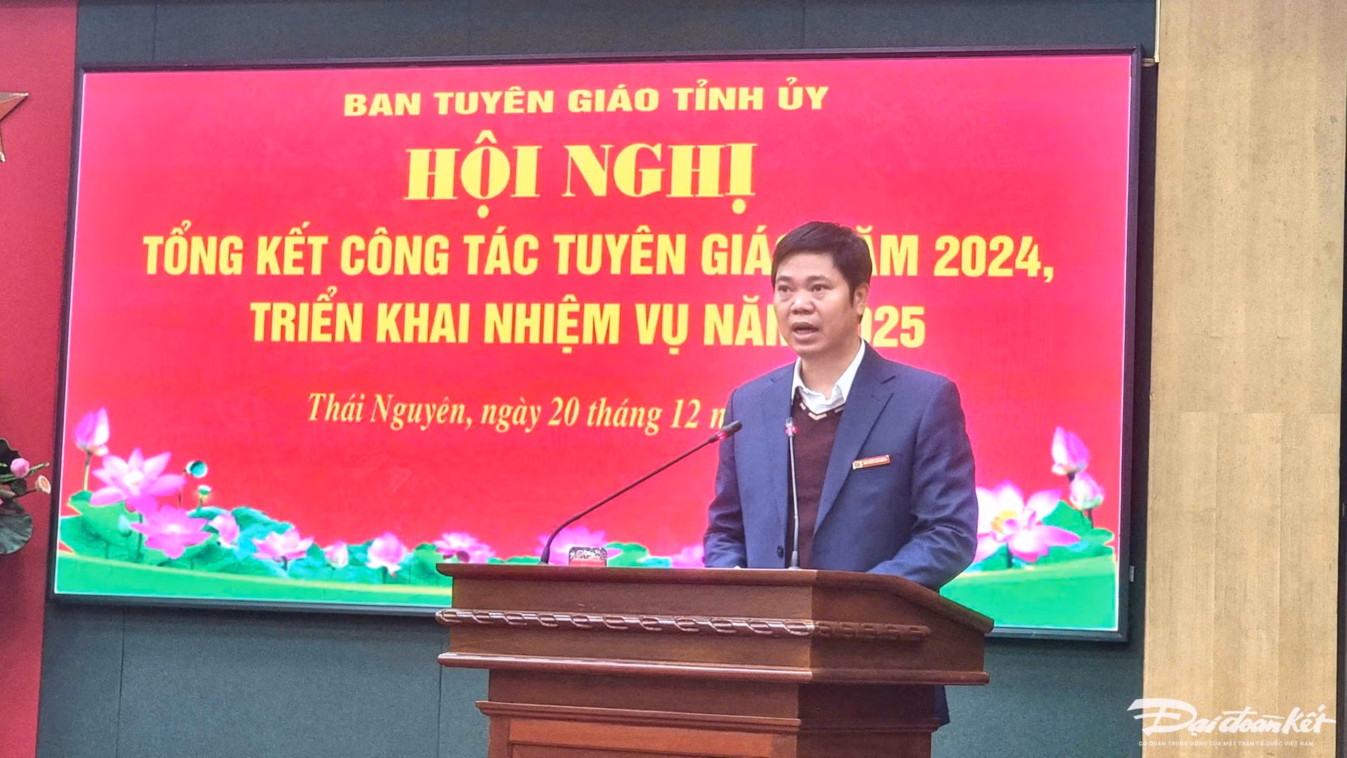 Năm 2024, ngành Tuyên giáo Thái Nguyên tham mưu, triển khai tuyên truyền, kịp thời các nghị quyết, chỉ thị, kết luận, quy định của Trung ương; các nhiệm vụ, kết quả phát triển kinh tế - xã hội, quốc phòng an ninh; định hướng hoạt động tuyên truyền, báo chí, xuất bản, thông tin đối ngoại và hợp tác quốc tế, tuyên truyền biển đảo, biên giới đất liền.