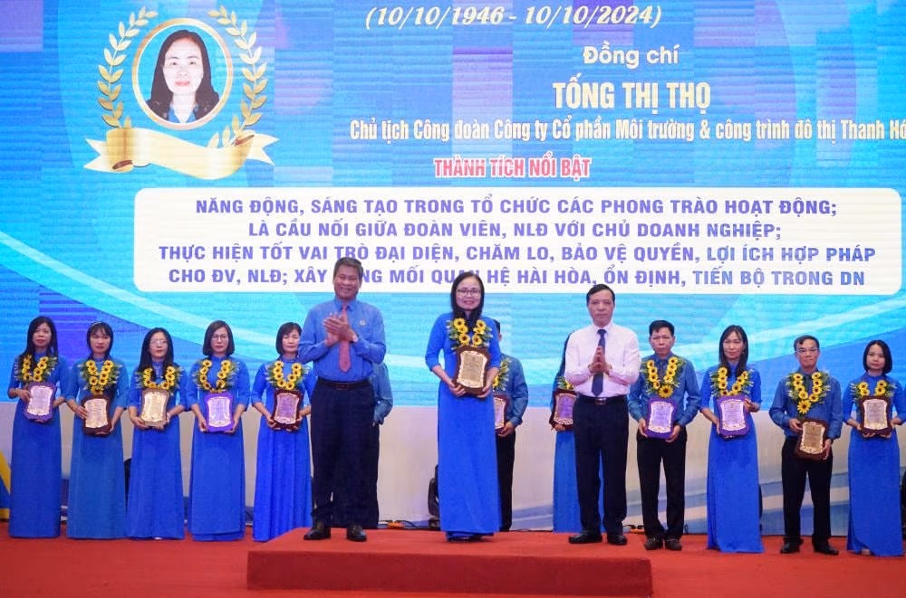 Tại lễ tôn vinh, đại diện lãnh đạo Tổng LĐLĐ Việt Nam, Tỉnh ủy Thanh Hóa, LĐLĐ tỉnh đã trao Kỷ niệm chương “Vì sự nghiệp xây dựng tổ chức Công đoàn” của Tổng LĐLĐ Việt Nam cho 20 cá nhân có thành tích xuất sắc và biểu dương 95 cán bộ Công đoàn tiêu biểu năm 2024.