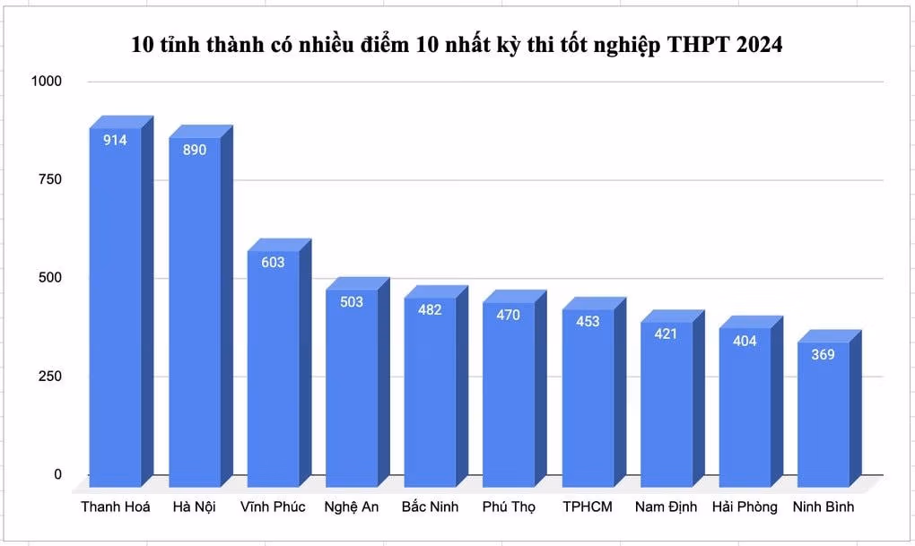 Trưa 17/7, Sở Giáo dục vào Đào tạo (GDĐT) tỉnh Thanh Hóa báo cáo về kết quả kỳ thi tốt nghiệp THPT năm 2024. Theo đó, năm nay, tỉnh là địa phương dẫn đầu toàn quốc với 914 điểm 10, xếp ngay sau là Hà Nội và Vĩnh Phúc.