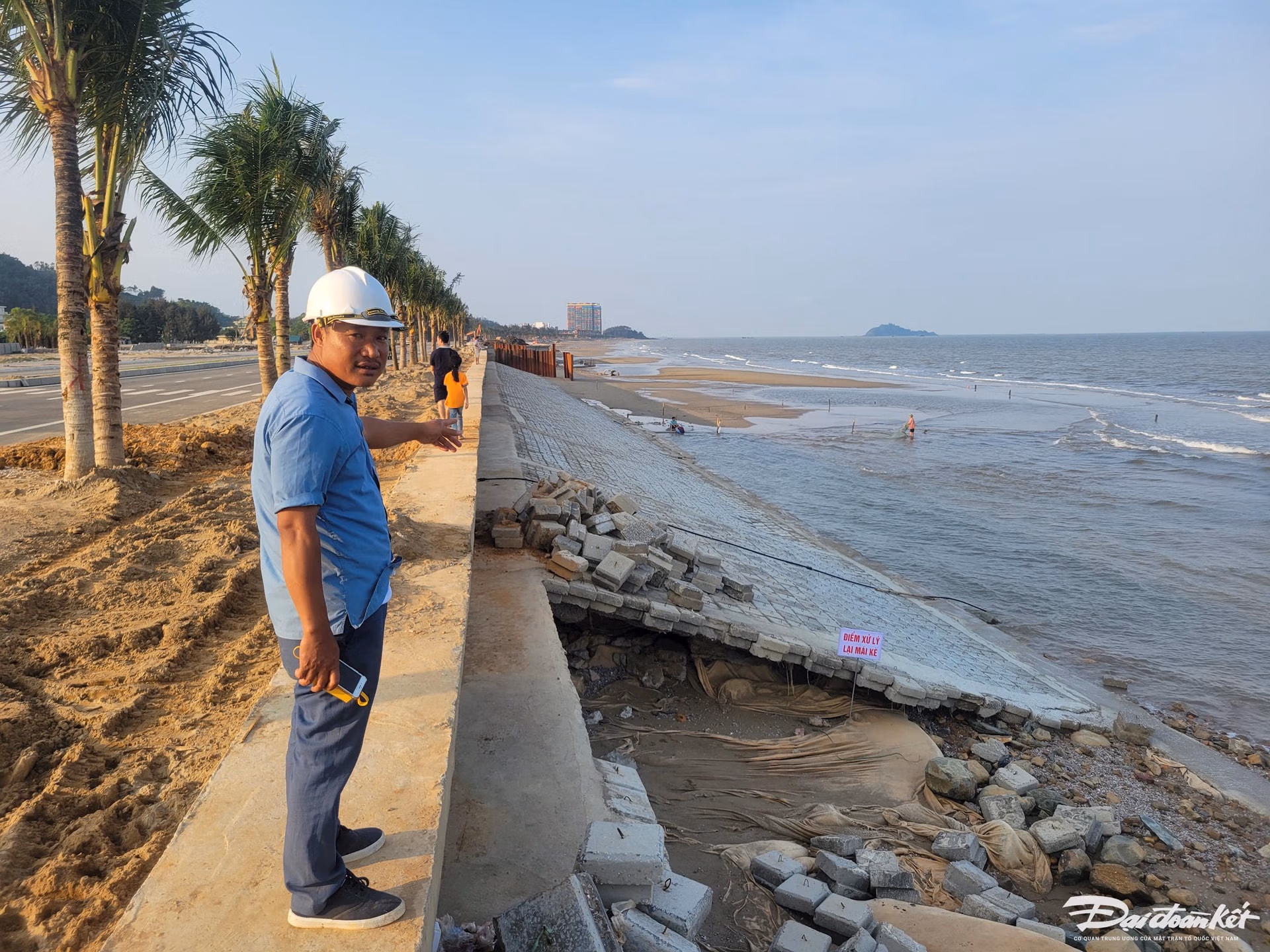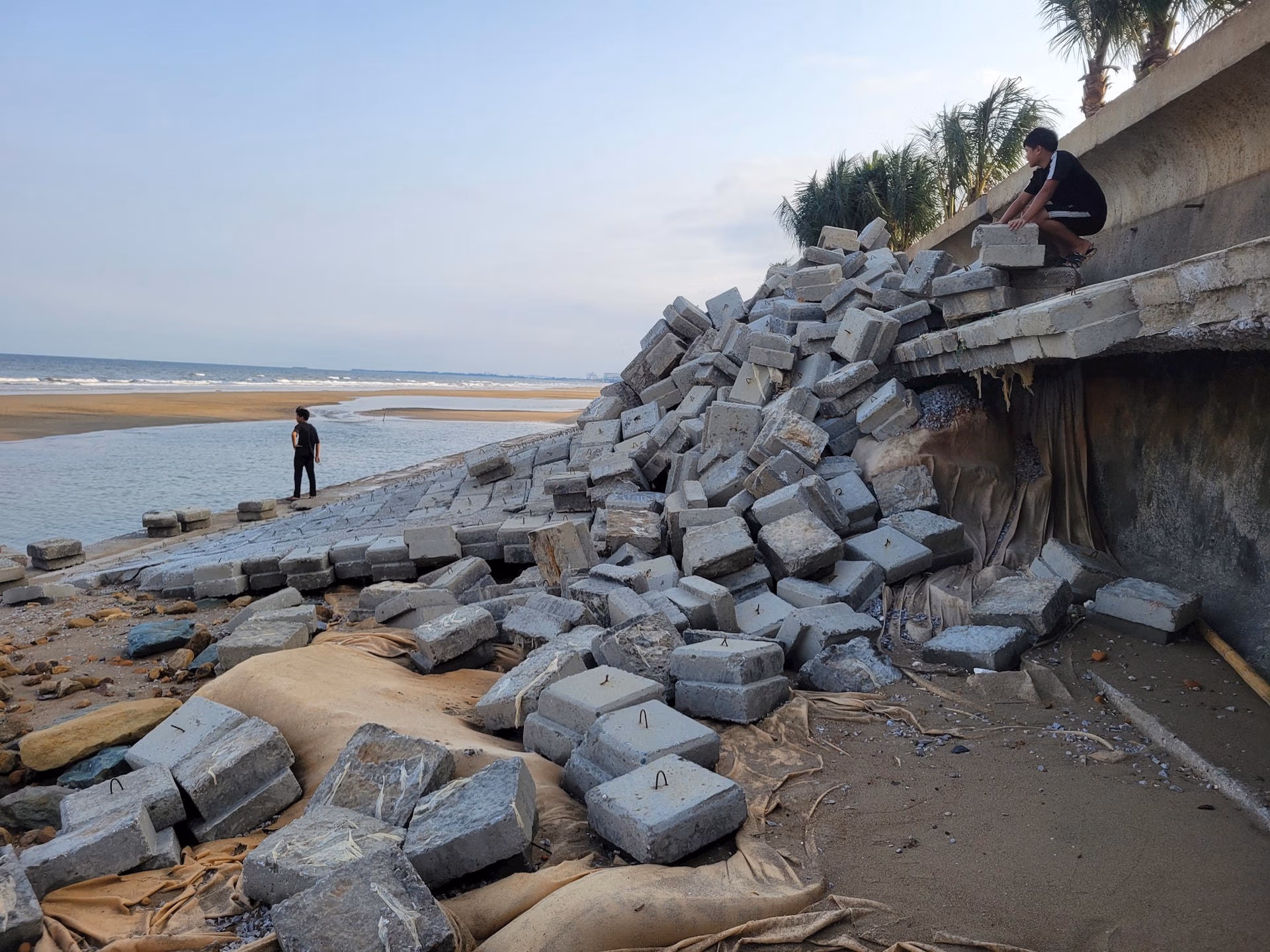 Bắt đầu thi công vào tháng 4/2024, sau hơn 1 tháng, đến nay, Công ty Tuấn Linh đã hoàn thành gần 200m bờ kè mái nghiêng. Tuy nhiên, trong quá trình thi công, mái kè thường xuyên bị sụt lún do thủy triều dâng cao, sóng đánh mạnh vào bờ khiến nước và cát lọt qua cấu kiện bê tông, thẩm thấu vào phần thân kè, sau đó cuốn trôi lớp đất và cát đắp nền ra biển. Từ đây, những mái kè có dấu hiệu bị rỗng ruột, sụt lún, nguy cơ đổ sập.