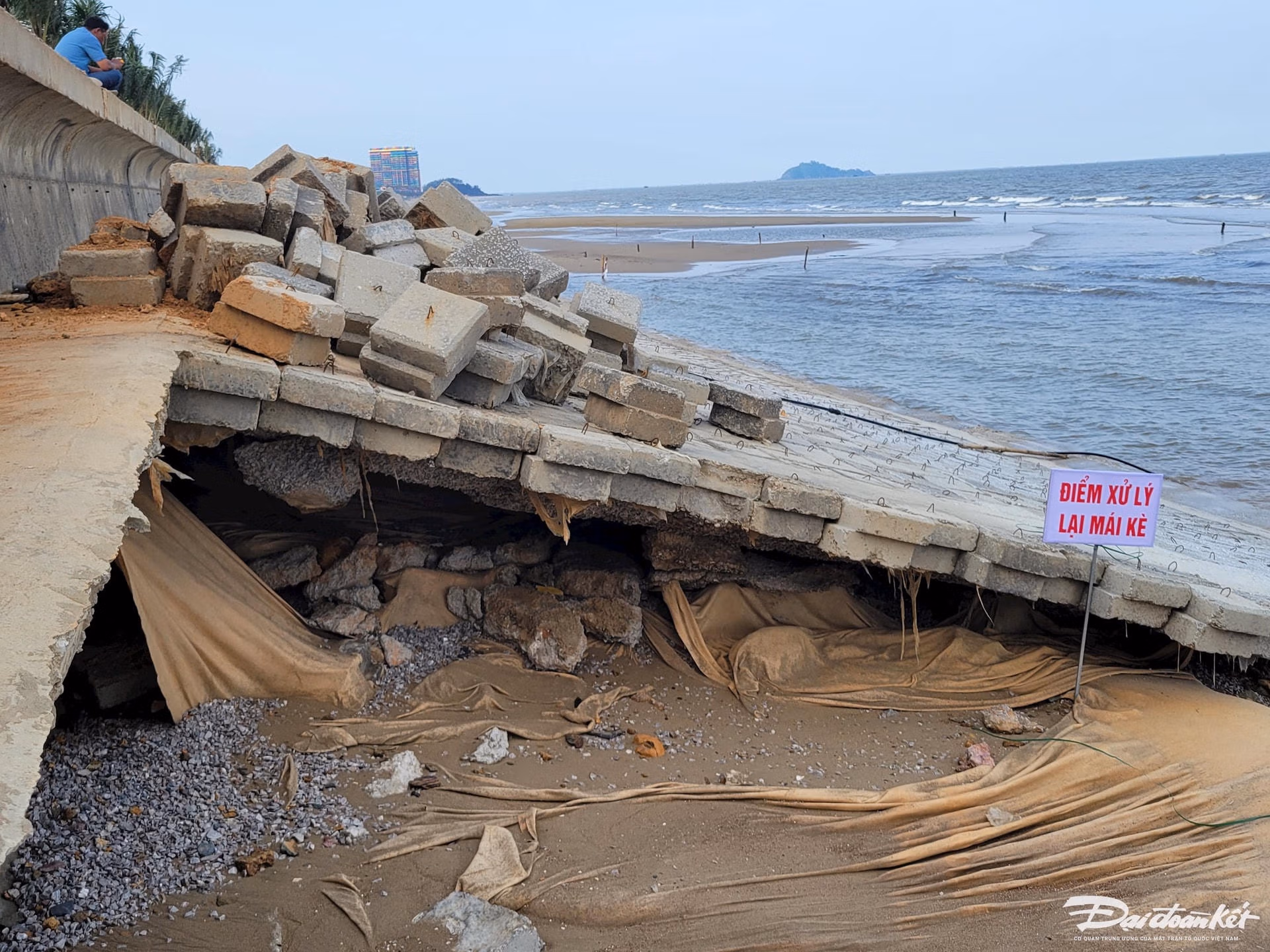 Theo ghi nhận của PV vào các ngày 5 và 6/5, một đoạn bờ kè mái nghiêng dài khoảng 10m, nằm tại thôn 1 (xã Hoằng Trường) đã bị bóc rời toàn bộ lớp cấu kiện bê tông đúc sẵn trên bề mặt. Với việc sóng đánh liên tục vào bờ, lớp đá lót, vải địa kỹ thuật và đất, cát tại phần kè này đã bị nước cuốn trôi ra biển, để lại một khoảng trống rất lớn, tách biệt đoạn kè dài 200m thành 2 phần riêng biệt.