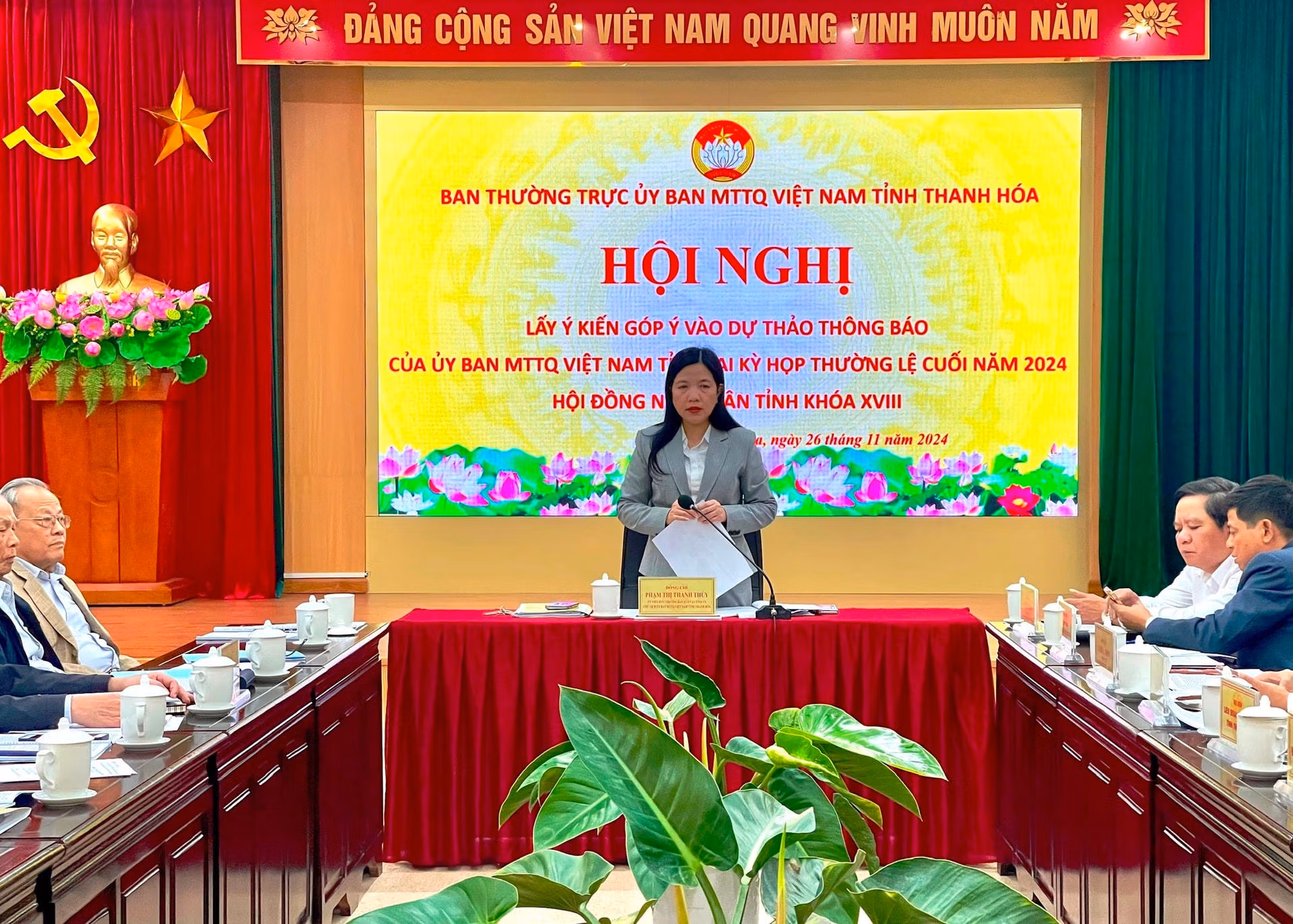 Phát biểu kết luận hội nghị, bà Phạm Thị Thanh Thủy, Trưởng Ban Dân vận, Chủ tịch Ủy ban MTTQ tỉnh Thanh Hóa đã trân trọng cảm ơn và ghi nhận những ý kiến đóng góp tâm huyết, trách nhiệm, xác đáng của các đại biểu; đồng thời cho biết, Ban Thường trực Ủy ban MTTQ tỉnh Thanh Hóa sẽ bổ sung các ý kiến góp ý tại hội nghị để hoàn thiện thông báo của Ủy ban MTTQ tỉnh, báo cáo tại kỳ họp cuối năm 2024, HĐNĐ tỉnh khóa XVIII sắp tới.