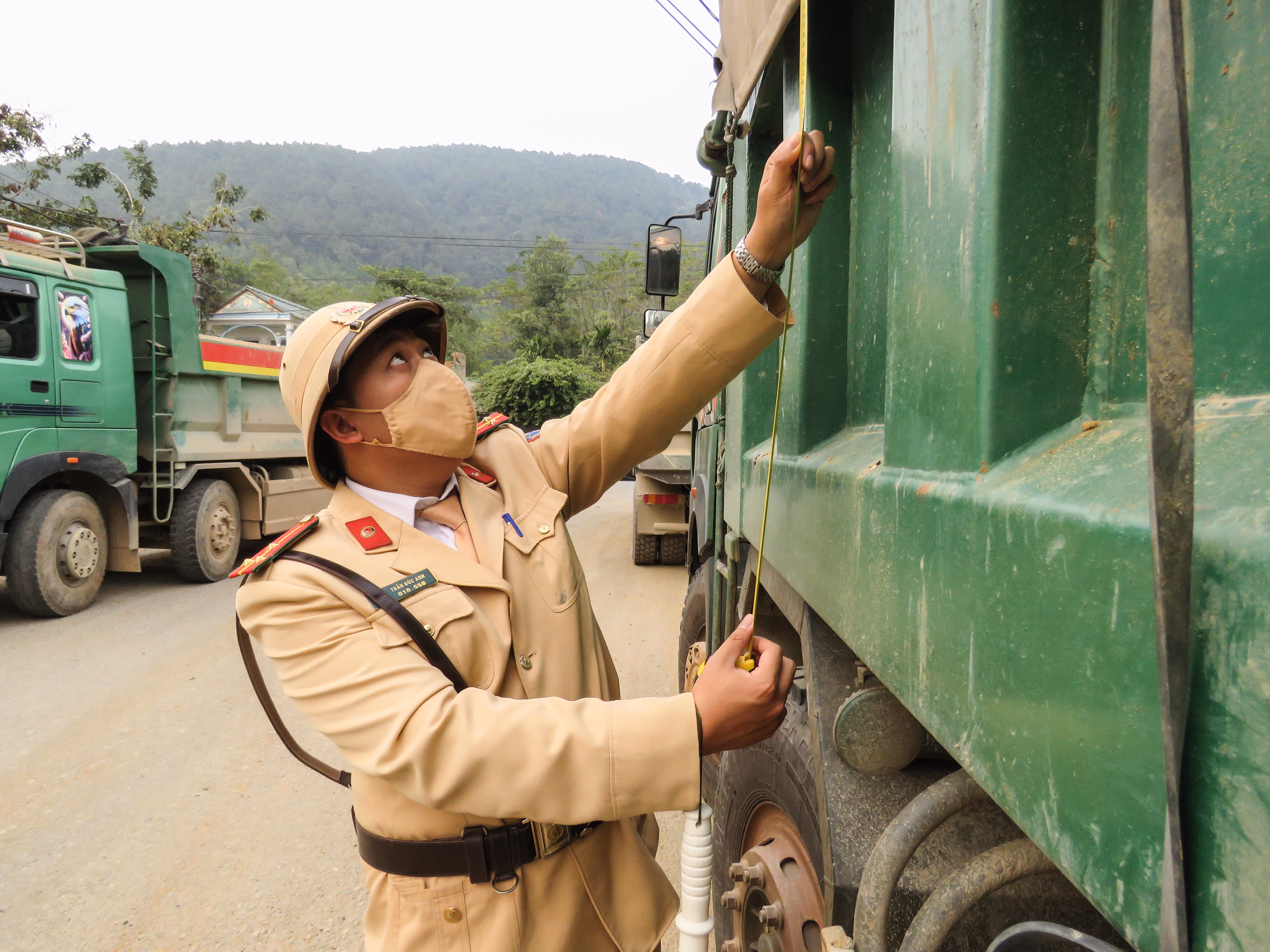 Chỉ trong khoảng 30 phút, phóng viên ghi nhận nhiều phương tiện chở khoáng sản bị lực lượng CSGT dừng xe kiểm tra giấy tờ, đo kích thước thành thùng, đồng thời đưa về trạm cân để kiểm tra tải trọng theo quy định.