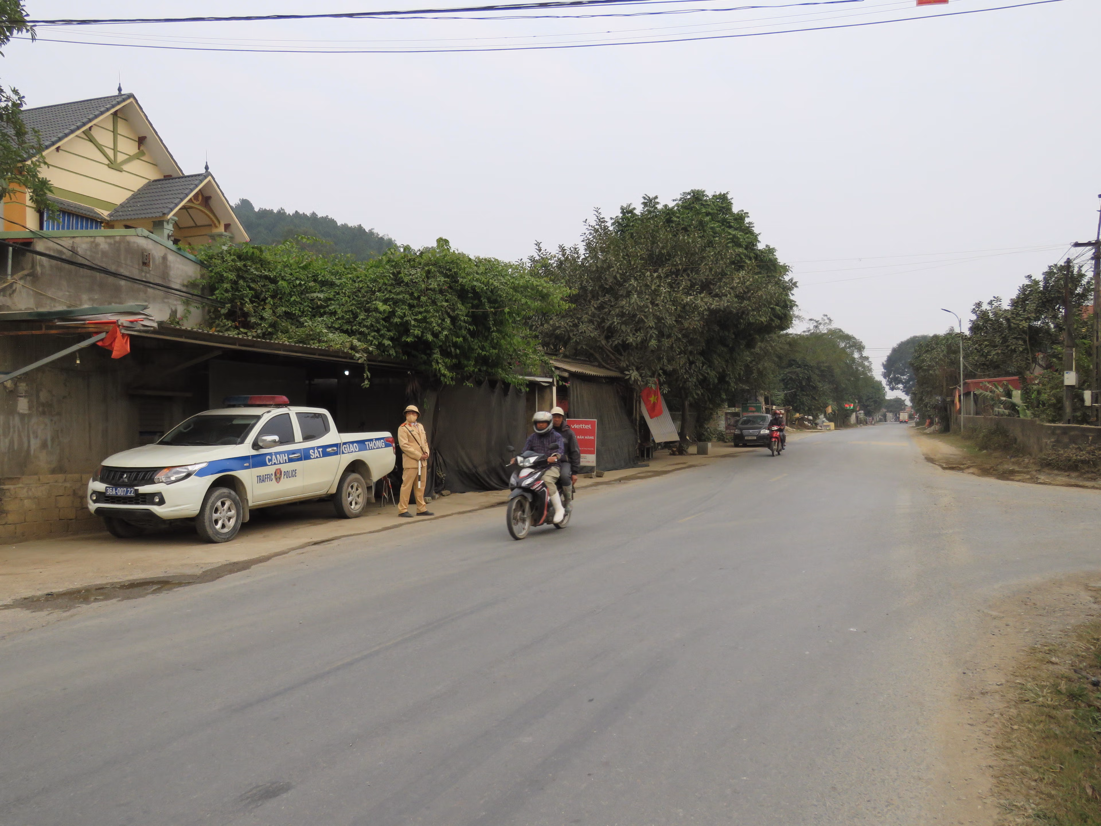 Tại ngã 3 giao cắt giữa đường liên thôn xã Hà Trung với QL217, Đội CSGT số 1 (Phòng CSGT Công an tỉnh Thanh Hóa) đã bố trí 2 xe chuyên dụng cùng 6 cán bộ tuần tra, kiểm soát.