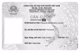 Từ trái qua phải, từ trên xuống dưới: Hình Quốc huy nước Cộng hòa xã hội chủ nghĩa Việt Nam; dòng chữ CỘNG HÒA XÃ HỘI CHỦ NGHĨA VIỆT NAM, Độc lập - Tự do - Hạnh phúc; SOCIALIST REPUBLIC OF VIET NAM, Independence - Freedom - Happiness; dòng chữ CĂN CƯỚC; IDENTITY CARD; biểu tượng chíp điện tử; Số định danh cá nhân/Personal identification number; Họ, chữ đệm và tên khai sinh/Full name; Ngày, tháng, năm sinh/Date of birth; Giới tính/Sex; Quốc tịch/Nationality.