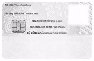 Mặt sau thẻ căn cước cấp cho công dân Việt Nam dưới 6 tuổi và thẻ căn cước cấp cho công dân Việt Nam từ đủ 6 tuổi trở lên gồm các thông tin từ trên xuống dưới, từ trái qua phải, như sau:Nơi cư trú/Place of residence; Nơi đăng ký khai sinh/Place of birth; Chíp điện tử; Mã QR; Ngày, tháng, năm cấp/Date of issue; Ngày, tháng, năm hết hạn/Date of expiry; BỘ CÔNG AN/MINISTRY OF PUBLIC SECURITY; Dòng MRZ.