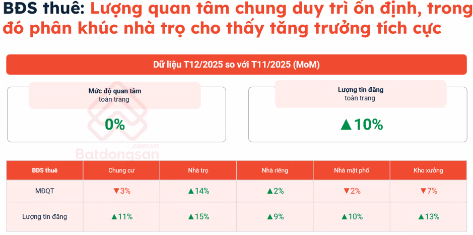 Báo cáo Batdongsan.com.vn về diễn biến thị trường bất động sản tháng 12/2025 cho biết mảng bất động sản cho thuê duy trì sự ổn định về nhu cầu nhưng có dấu hiệu đi lên về nguồn cung. Lượng tin đăng cho thuê trên toàn quốc tăng 10% trong tháng 12/2025. Đặc biệt tại Hà Nội, lượng tin đăng cho thuê nhà trọ và nhà mặt phố tăng lần lượt là 20% và 22% so với tháng 11.