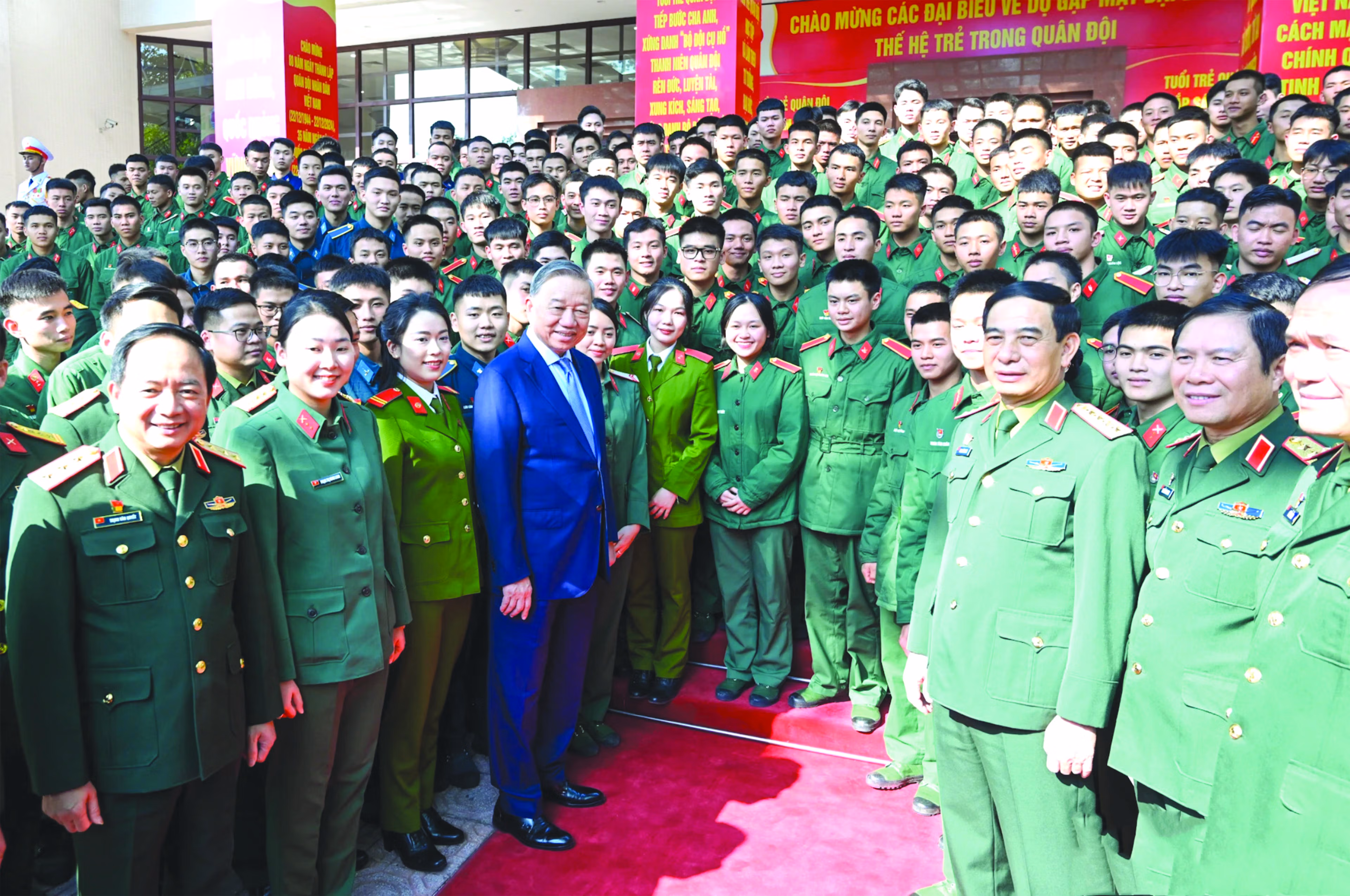 Trong dịp gặp mặt các đại biểu thanh niên quân đội ưu tú tháng 12/2024, Tổng Bí thư Tô Lâm khẳng định: Dưới sự lãnh đạo của Đảng, sự quan tâm, nuôi dưỡng của cả dân tộc, lớp lớp thanh niên Việt Nam, trong đó có thanh niên Quân đội là lực lượng xung kích đi đầu, sẵn sàng xả thân vì lý tưởng Cách mạng.
