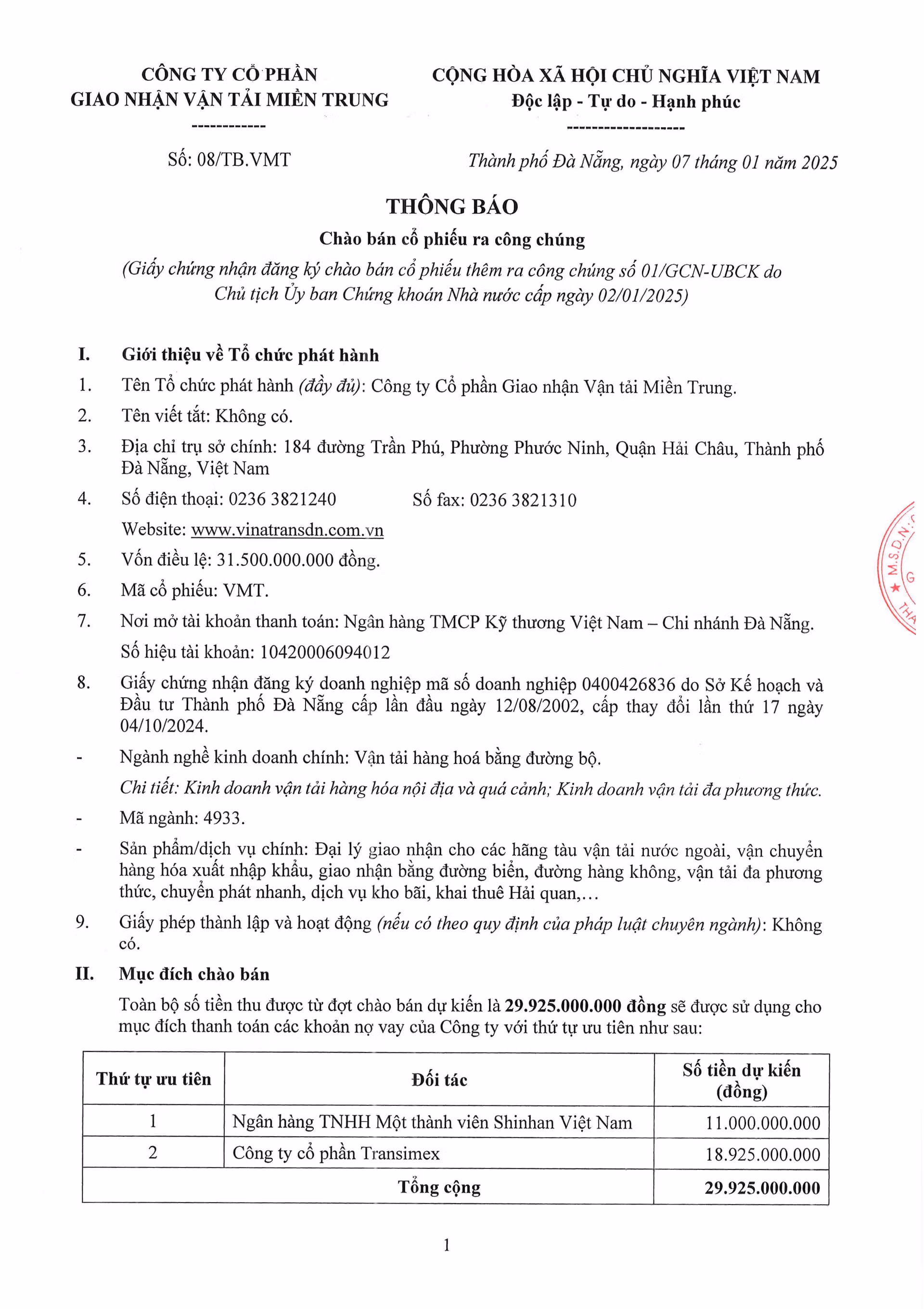 Thông báo chào bán cổ phiếu Thứ Sáu 10/01/2025 08:00 (GMT+7) Công ty cổ phần Giao nhận Vận tải miền Trung thông báo chào bán cổ phiếu ra công chúng: Thanh Thanh