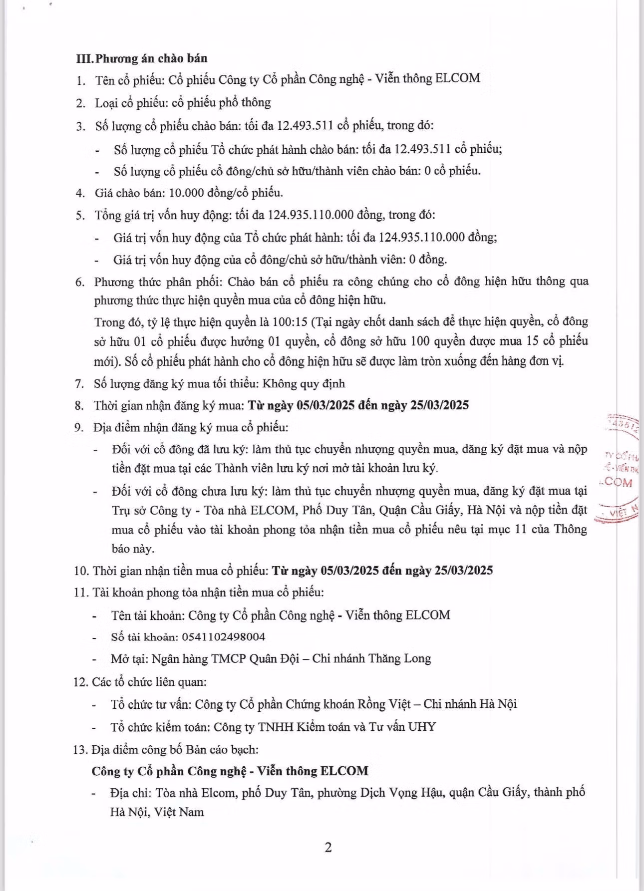 Thông báo chào bán cổ phiếu cho cổ đông hiện hữu Thứ Tư 12/02/2025 08:00 (GMT+7) Công ty Cổ phần Công nghệ - Viễn thông ELCOM chào bán cổ phiếu PV