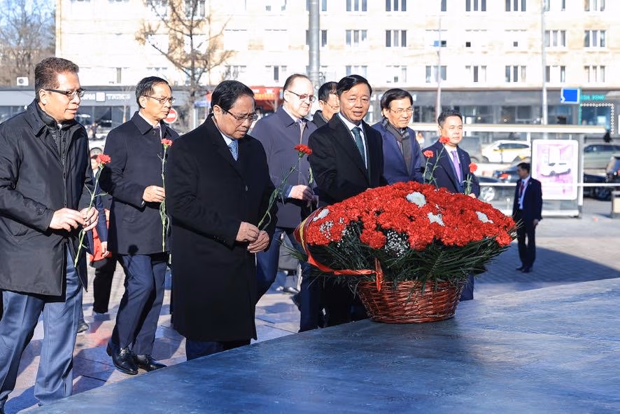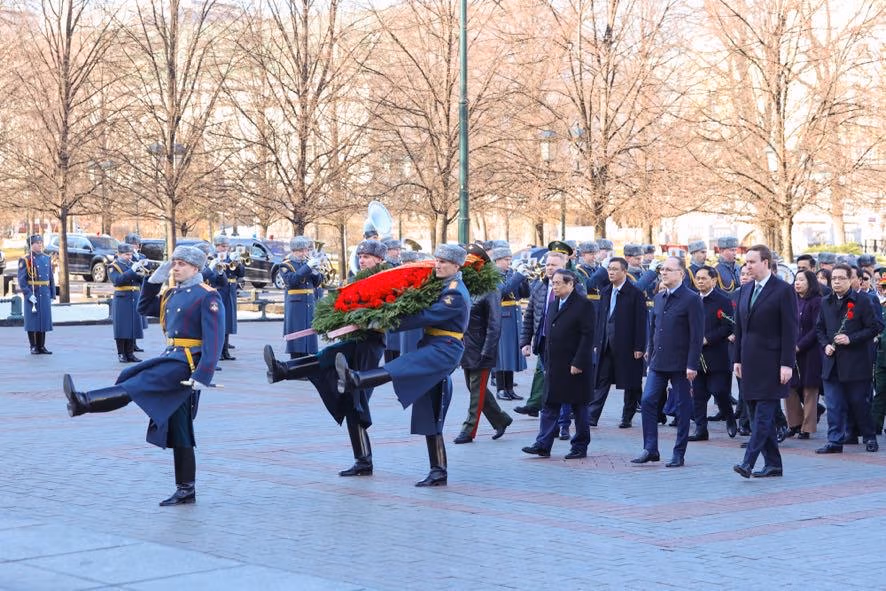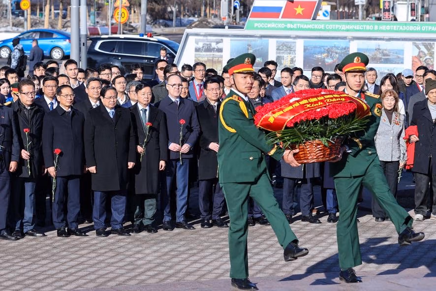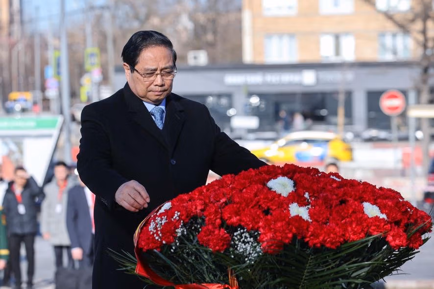 Trong không khí trang nghiêm xúc động, Thủ tướng Phạm Minh Chính cùng đoàn đại biểu cấp cao Việt Nam đã dâng hoa tưởng nhớ Chủ tịch Hồ Chí Minh, lãnh tụ kính yêu của nhân dân Việt Nam, nhà lãnh đạo lỗi lạc của Đảng Cộng sản Việt Nam và phong trào cộng sản thế giới, Anh hùng giải phóng dân tộc, nhà văn hóa kiệt xuất. Chủ tịch Hồ Chí Minh cũng là người bạn lớn của nhân dân Nga - Người đã đặt nền móng cho mối quan hệ hữu nghị truyền thống giữa hai nước Việt Nam và Liên bang Nga.