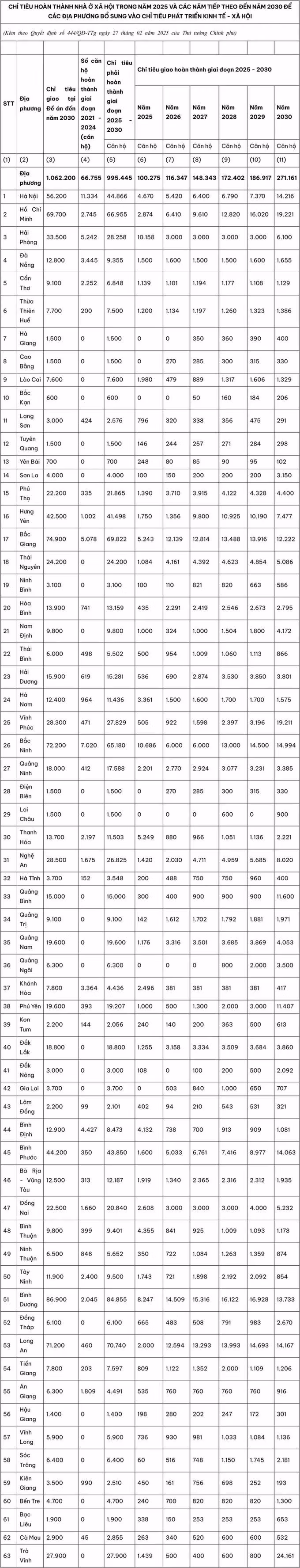 Cụ thể, chỉ tiêu nhà ở xã hội các địa phương phải hoàn thành giai đoạn 2025 - 2030 là 995.445 căn hộ.
