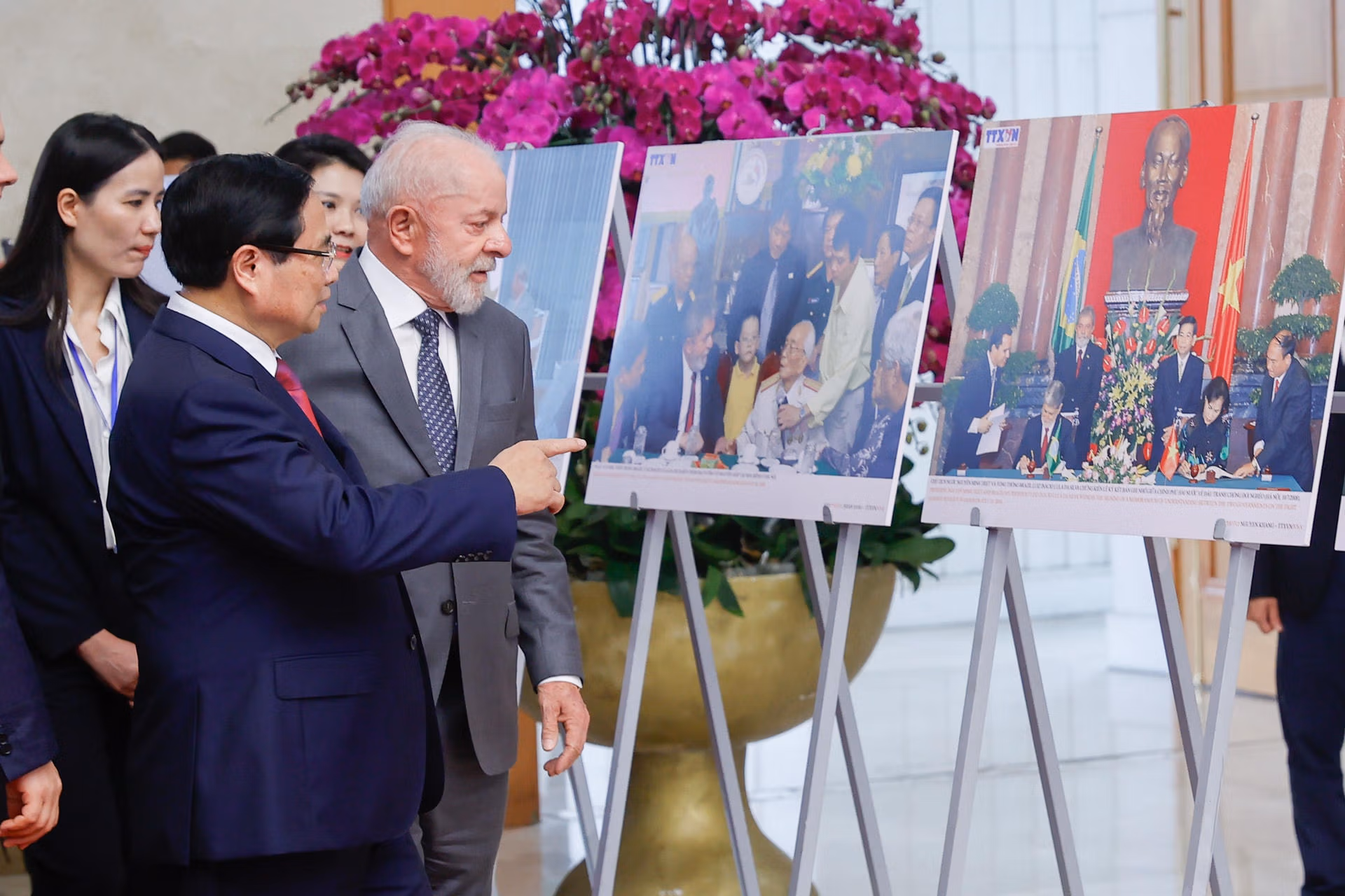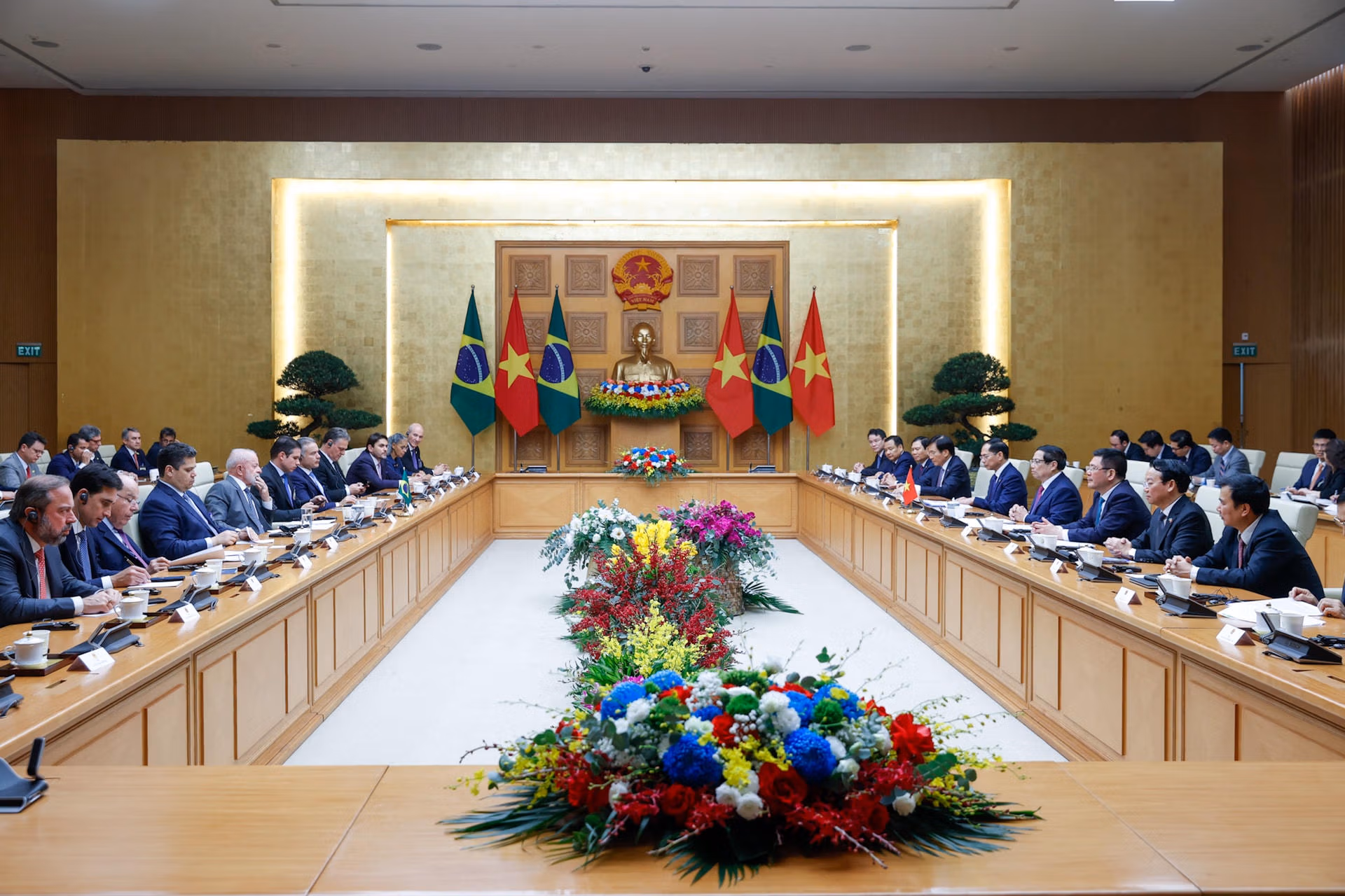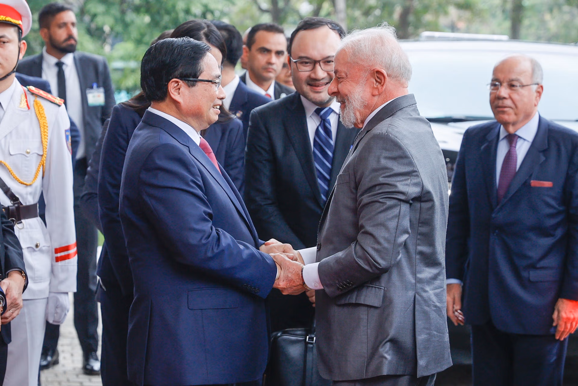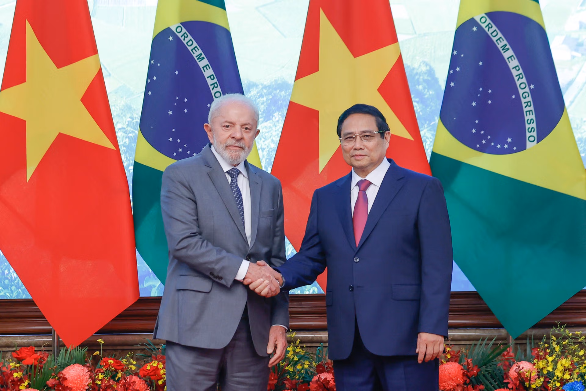 Thủ tướng Chính phủ Phạm Minh Chính chào mừng Tổng thống Lula da Silva và Đoàn đại biểu cấp cao Brazil tới thăm Việt Nam; nhắc lại ấn tượng sâu sắc về đất nước, con người Brazil và các cuộc gặp với Tổng thống Lula da Silva, gần đây nhất là trong chuyến thăm chính thức Brazil vào tháng 9/2023 và cuộc hội đàm song phương vào tháng 11/2024 tại Rio de Janeiro, nơi hai bên ra Tuyên bố nâng cấp quan hệ song phương lên Đối tác chiến lược.