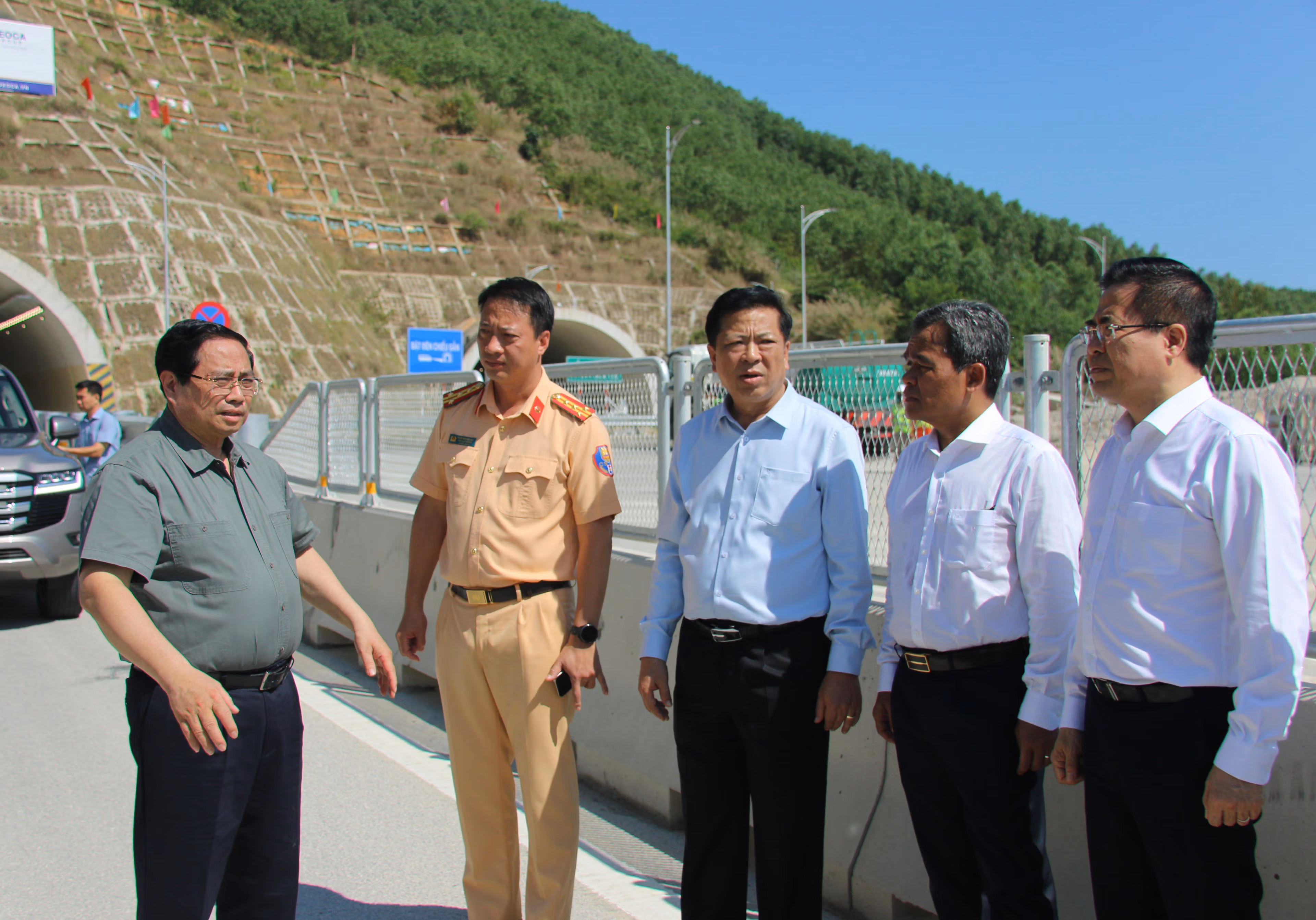 Thủ tướng Chính phủ Phạm Minh Chính thị sát một số điểm trên cao tốc Quảng Ngãi-Hoài Nhơn, gồm nút giao cao tốc với Quốc lộ 24; hầm số 1 và hầm số 2.