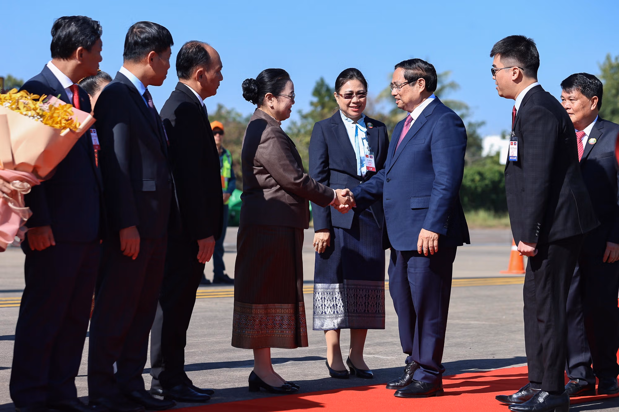 Đón Thủ tướng Phạm Minh Chính và đoàn đại biểu Việt Nam tại sân bay có Bộ trưởng, Chủ nhiệm Văn phòng Phủ Thủ tướng Bouakhong Nammavong; Thứ trưởng Bộ Ngoại giao, Lãnh đạo Thủ đô Vientiane, Đại sứ Lào tại Việt Nam Khamphao Ernthavanh; Chánh Văn phòng Ủy ban Hợp tác Lào – Việt Nam Viengsan Chantha; lãnh đạo các vụ thuộc Bộ Ngoại giao Lào. Về phía Việt Nam có Thứ trưởng Bộ Ngoại giao Nguyễn Mạnh Cường; Đại sứ Việt Nam tại Lào Nguyễn Minh Tâm; đại diện các cơ quan Đại diện Việt Nam tại Lào, cán bộ, nhân viên Đại sứ quán, cộng đồng người Việt Nam tại Lào.
