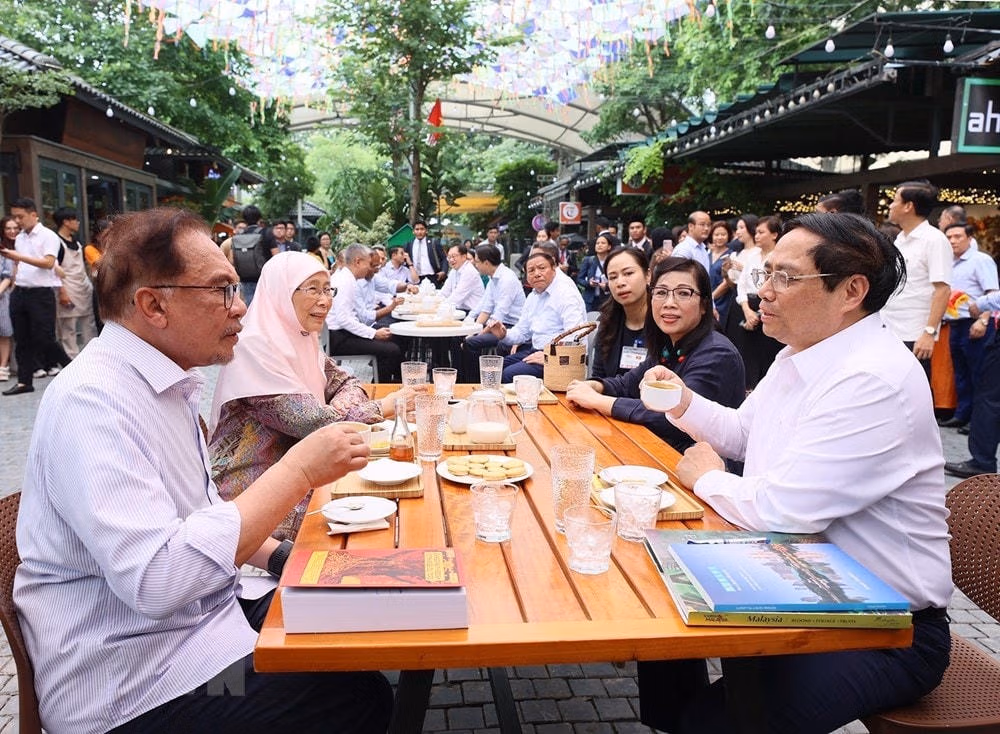 Sáng 21/7/2023, Thủ tướng Phạm Minh Chính và Phu nhân cùng Thủ tướng Malaysia Anwar Ibrahim và Phu nhân thăm không gian đọc sách và thưởng thức càphê tại Phố sách 19/12, quận Hoàn Kiếm, Hà Nội.