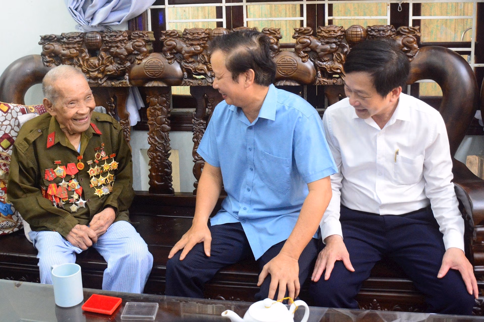 Theo đó, đoàn công tác đã đến thăm ông Nguyễn Vĩnh Cù (92 năm tuổi, trú tại 284 Phan Chu Trinh, phường An Cựu, thành phố Huế) và ông Hoàng Minh Tuấn (102 tuổi, trú tại 180/2 Phan Bội Châu, phường Vĩnh Ninh, thành phố Huế) là những người từng tham gia chiến đấu, phục vụ chiến đấu trong Chiến dịch Điện Biên Phủ.
