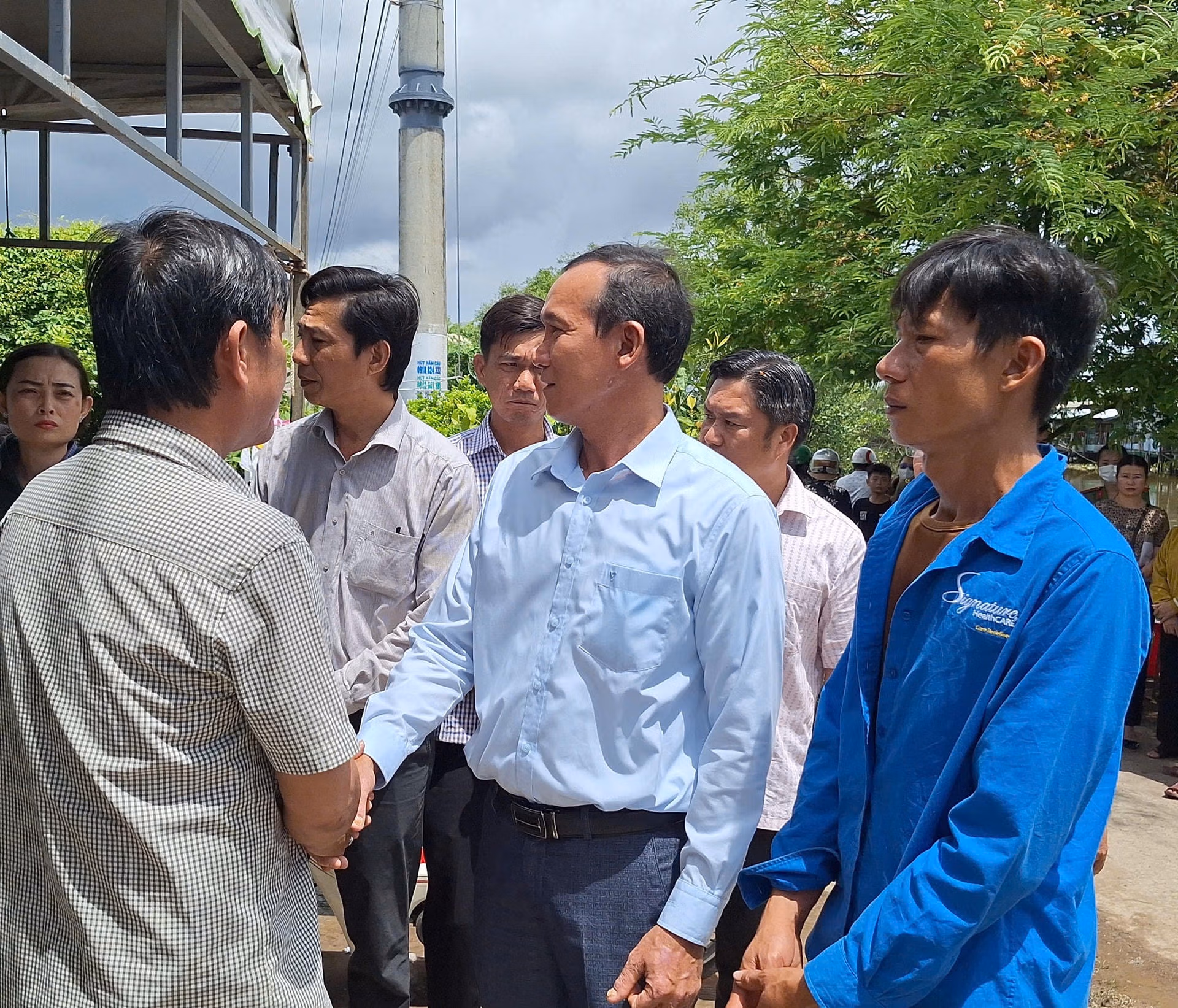 Bí thư Huyện ủy Hòa Bình Lý Công Bắc thăm hỏi, động viên tinh thần gia đình cố gắng vượt qua nỗi đau mất mát của gia đình cháu N.T. H. Ảnh: Nguyên Du