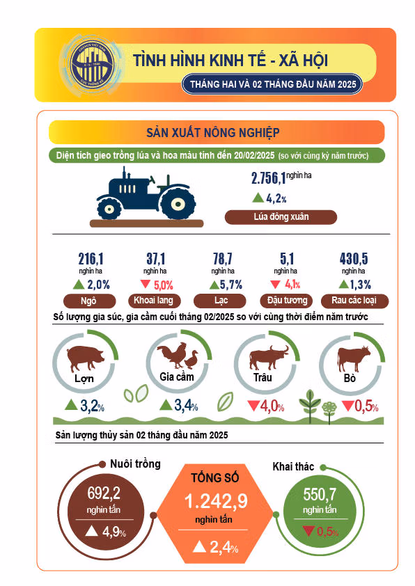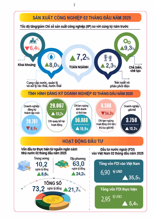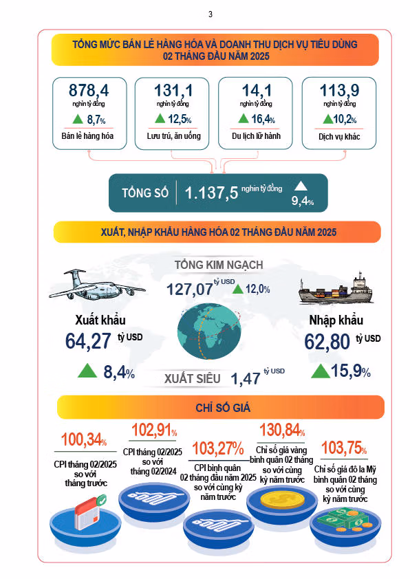 Tình hình kinh tế - xã hội tháng 2/2025 Thứ Năm 06/03/2025 16:42 (GMT+7) Ngày 6/3, Cục Thống kê (Bộ Tài chính) công bố một số tình hình kinh tế - xã hội tháng 2/2025. Nguồn: Cục Thống kê (Bộ Tài chính) Thái Nhung