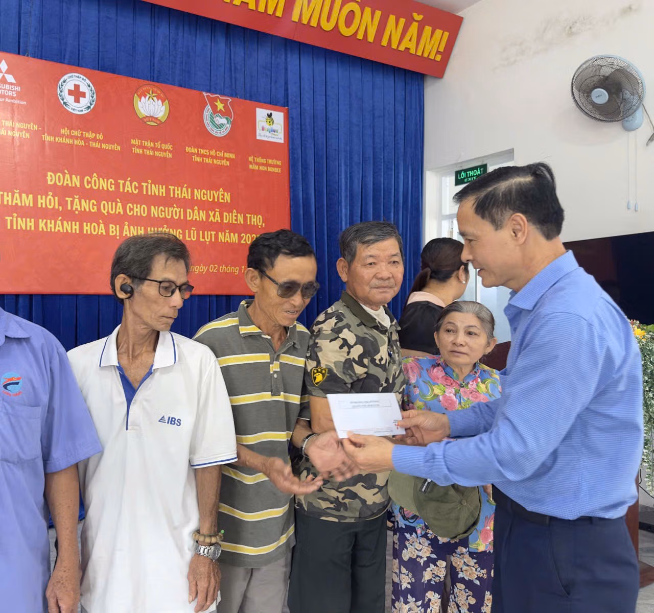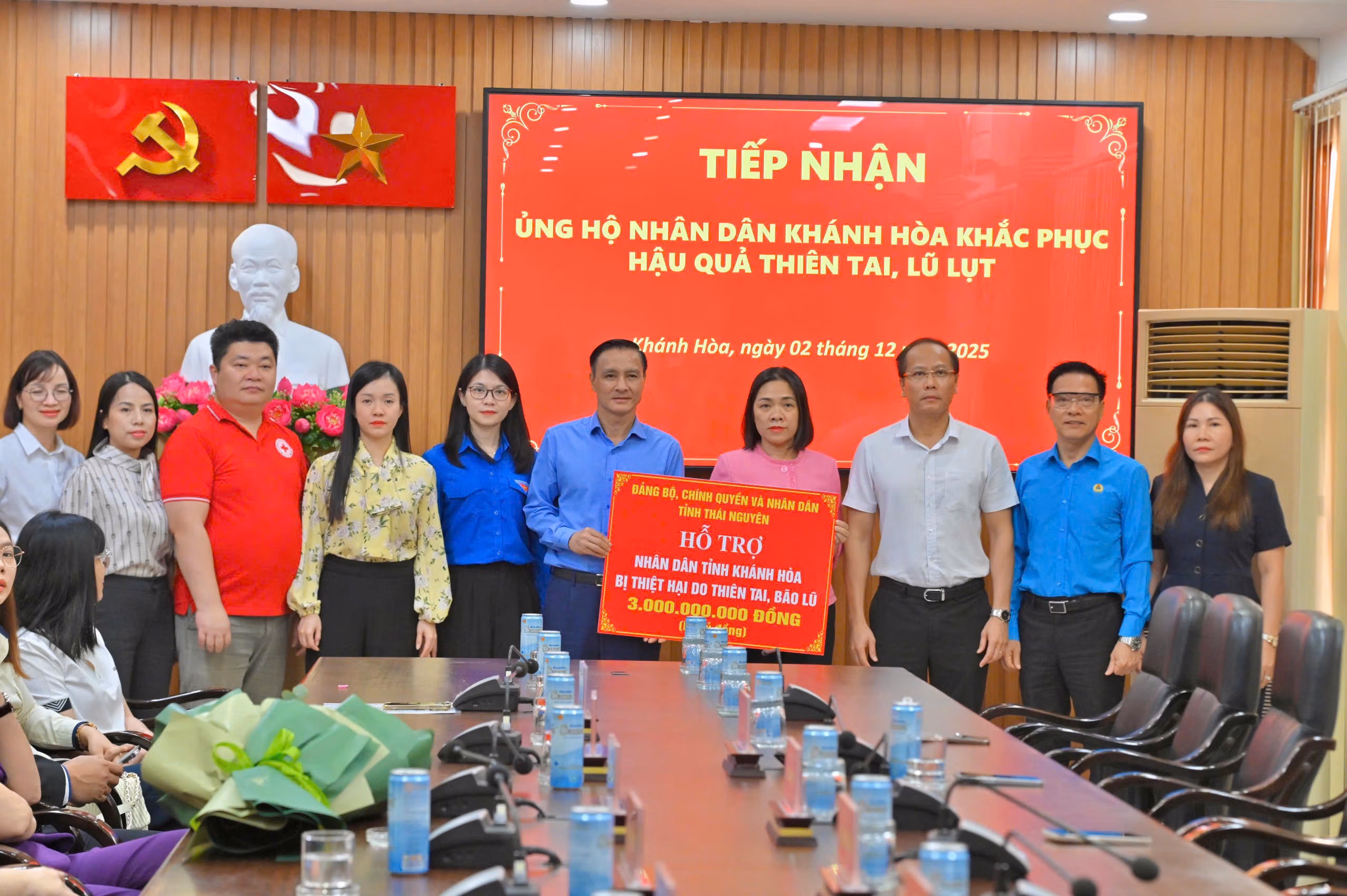 Đoàn công tác của tỉnh Thái Nguyên còn có đại diện Hội Liên hiệp Phụ nữ tỉnh, Tỉnh Đoàn, Hội LHTN Việt Nam tỉnh, Hội đồng đội tỉnh và Hội Chữ thập đỏ tỉnh đã đến thăm hỏi, động viên và trao kinh phí hỗ trợ tỉnh Khánh Hòa khắc phục hậu quả thiên tai, bão lũ.