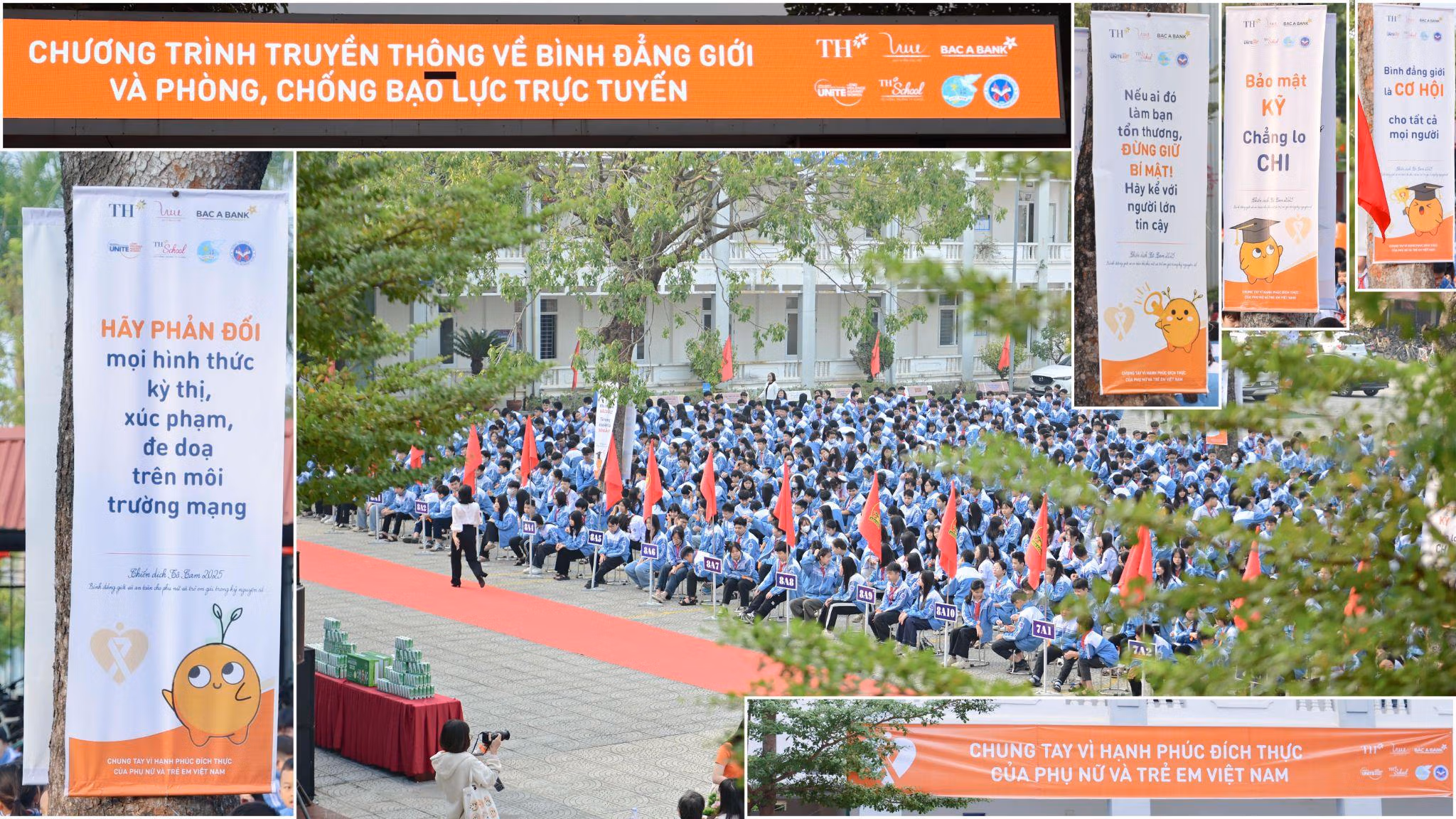 Ngay từ sáng sớm, sân trường đã rực rỡ sắc cam, màu biểu tượng của nỗ lực toàn cầu nhằm chấm dứt bạo lực, đặc biệt với phụ nữ và trẻ em. Hào hứng và tràn đầy năng lượng, 1.511 học sinh đã trở thành những người tham gia tích cực và chủ động trong từng nội dung của buổi truyền thông.