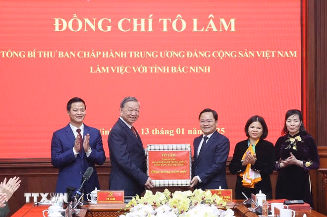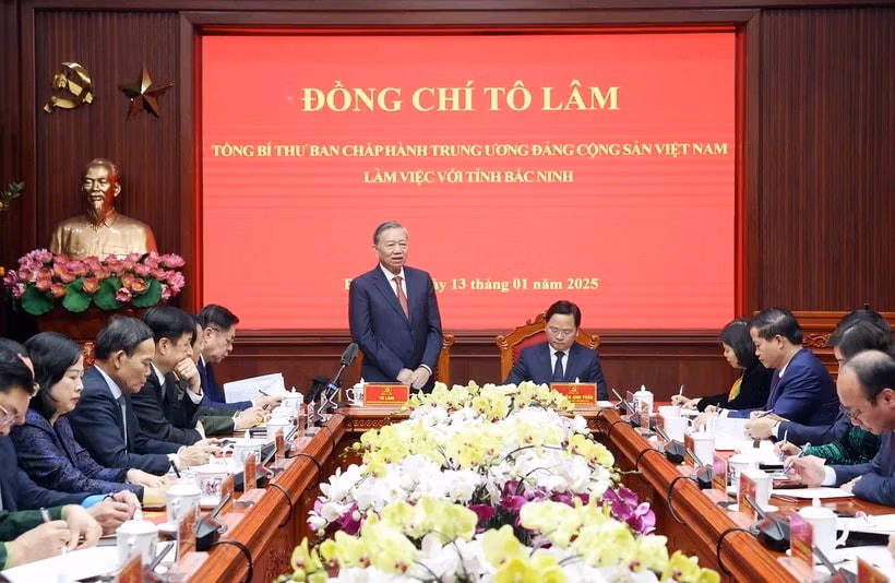 Chiều 13/1, tại Bắc Ninh, Tổng Bí thư Tô Lâm và Đoàn công tác Trung ương đã thăm và làm việc với Ban Chấp hành Đảng bộ tỉnh Bắc Ninh, đánh giá tình hình thực hiện Nghị quyết Đại hội Đảng bộ tỉnh khóa XX; kết quả thực hiện Nghị quyết 18 về việc sắp xếp, tinh giản tổ chức bộ máy tinh gọn đảm bảo hiệu năng, hiệu lực, hiệu quả và hoàn thiện các tiêu chí của đô thị loại I, trở thành thành phố trực thuộc Trung ương; phương hướng, mục tiêu, nhiệm vụ trong thời gian tới.