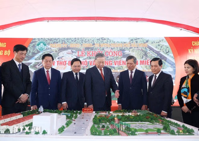 Chiều cùng ngày, Tổng Bí thư Tô Lâm và Đoàn công tác Trung ương đã dự và nhấn nút khởi công công trình “Đền thờ Bác Hồ và Công viên Văn Miếu” tại thành phố Bắc Ninh.