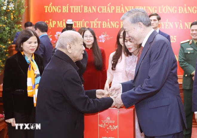Nhân dịp đón Tết cổ truyền của dân tộc - Xuân Ất Tỵ 2025, Tổng Bí thư Tô Lâm đã tặng quà các đồng chí nguyên Bí thư Tỉnh ủy đã nghỉ hưu, các trí thức, chức sắc tôn giáo, Mẹ Việt Nam Anh hùng, Anh hùng Lực lượng Vũ trang nhân dân, Anh hùng Lao động, thương binh, bệnh binh, học sinh đạt Huy chương Vàng Quốc tế năm 2024.