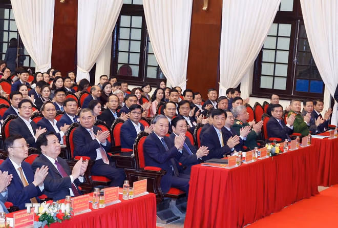 Nhân dịp này, thay mặt lãnh đạo Đảng, Nhà nước, Tổng Bí thư Tô Lâm trao tặng Huân chương Lao động hạng Nhất cho Học viện Chính trị quốc gia Hồ Chí Minh đã có thành tích xuất sắc trong thực hiện Nghị quyết 18-NQ/TW Một số vấn đề về tiếp tục đổi mới, sắp xếp tổ chức bộ máy của hệ thống chính trị tinh gọn, hoạt động hiệu lực, hiệu quả.