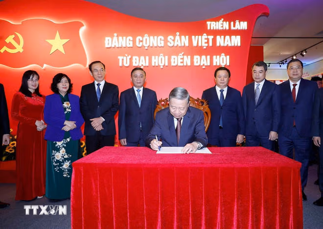 Ghi sổ lưu bút tại đây, Tổng Bí thư Tô Lâm bày tỏ xúc động và tự hào khi tham quan triển lãm "Đảng Cộng sản Việt Nam - từ Đại hội đến Đại hội." Những tư liệu, hình ảnh, hiện vật được lưu giữ cẩn thận đã tái hiện sống động hành trình ra đời và phát triển của Đảng ta. Từ những ngày đầu đầy hy sinh, gian khó; kiên cường, bất khuất trong đấu tranh giành độc lập, giải phóng dân tộc đến vững vàng tự chủ trong sự nghiệp xây dựng, bảo vệ, đổi mới và phát triển đất nước ngày nay.