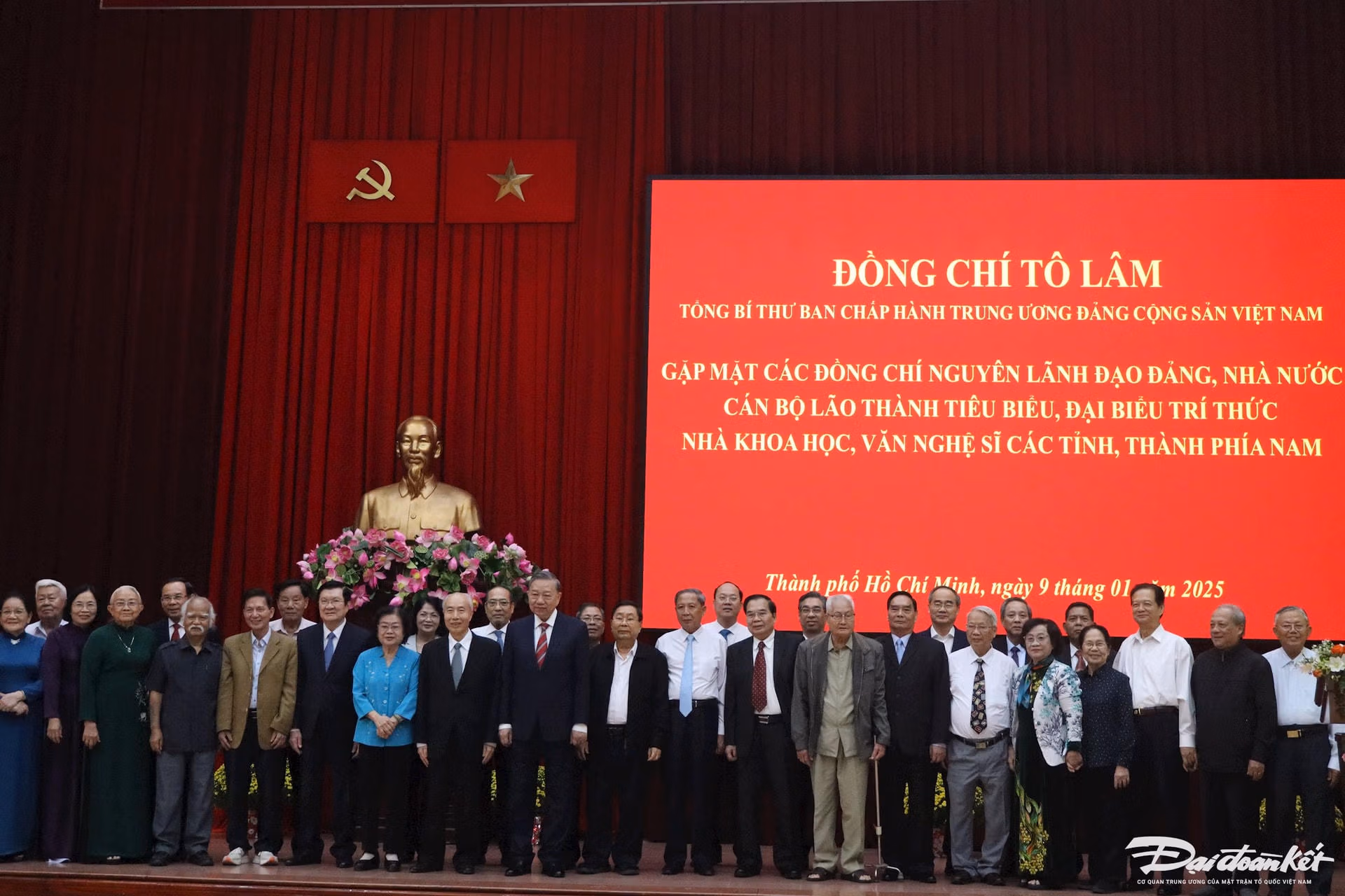 Trong không khí của những ngày đầu năm mới 2025 và chuẩn bị đón Tết Nguyên đán cổ truyền của dân tộc, Tổng Bí thư Tô Lâm thay mặt lãnh đạo Đảng, Nhà nước và với tình cảm cá nhân, gửi lời cảm ơn chân thành và kính chúc tới các đồng chí nguyên lãnh đạo Đảng, Nhà nước, cán bộ lão thành tiêu biểu và đại biểu trí thức, nhà khoa học, văn nghệ sĩ các tỉnh, thành phố phía Nam một năm mới dồi dào sức khỏe, hạnh phúc.