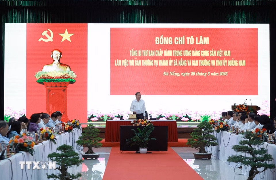 Tổng Bí thư làm việc với Ban Thường vụ Thành ủy Đà Nẵng và Tỉnh ủy Quảng Nam Thứ Bảy 29/03/2025 17:59 (GMT+7) Chiều 29/3, tại thành phố Đà Nẵng, Tổng Bí thư Tô Lâm làm việc với Ban Thường vụ Thành ủy Đà Nẵng và Ban Thường vụ Tỉnh ủy Quảng Nam. Tổng Bí thư Tô Lâm làm việc với Ban Thường vụ Thành ủy Đà Nẵng và Ban Thường vụ Tỉnh ủy Quảng Nam. (Ảnh: Thống Nhất/TTXVN)Tổng Bí thư Tô Lâm phát biểu chỉ đạo. (Ảnh: Thống Nhất/TTXVN)Tổng Bí thư Tô Lâm phát biểu chỉ đạo. (Ảnh: Thống Nhất/TTXVN)Tổng Bí thư Tô Lâm thăm dự án đầu tư, xây dựng Bến cảng Liên Chiểu-phần cơ sở hạ tầng dùng chung. (Ảnh: Thống Nhất/TTXVN)Tổng Bí thư Tô Lâm thăm tặng quà cho các đơn vị xây dựng, thi công dự án đầu tư, xây dựng Bến cảng Liên Chiểu-phần cơ sở hạ tầng dùng chung. (Ảnh: Thống Nhất/TTXVN)Tổng Bí thư Tô Lâm thăm Khu Công viên Phần mềm số 2. (Ảnh: Thống Nhất/TTXVN) Theo TTXVN