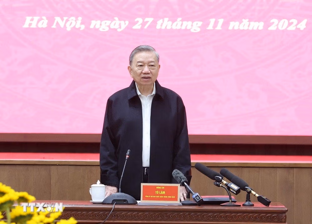 Sáng 27/11, tại Trụ sở Thành ủy Hà Nội, Tổng Bí thư Tô Lâm làm việc với Ban Thường vụ Thành ủy Hà Nội để nghe báo cáo kết quả về công tác xây dựng Đảng, xây dựng hệ thống chính trị, phát triển kinh tế-xã hội, quốc phòng-an ninh, đối ngoại của thành phố năm 2024 và kế hoạch năm 2025, giai đoạn 2025-2030.