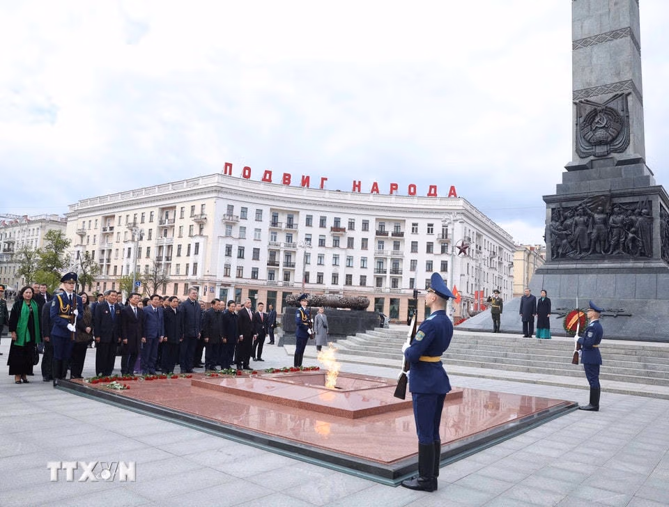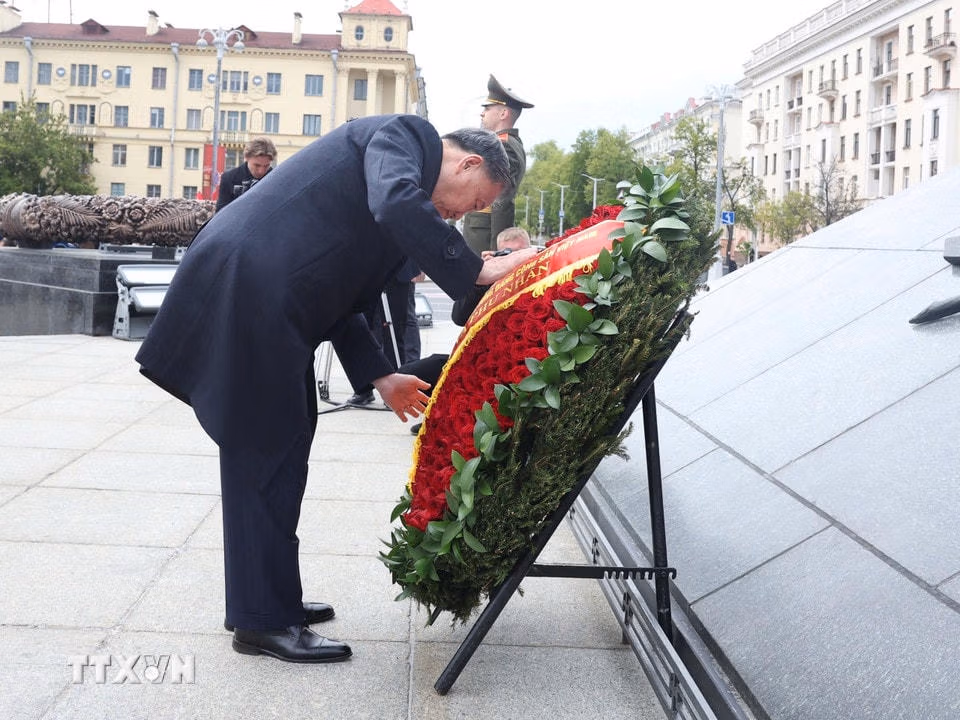 Mở đầu chương trình thăm cấp Nhà nước tới Cộng hòa Belarus, chiều 11/5, Tổng Bí thư Tô Lâm và Phu nhân cùng Đoàn đại biểu cấp cao Việt Nam đến đặt hoa tại Tượng đài Chiến thắng ở thủ đô Minsk.