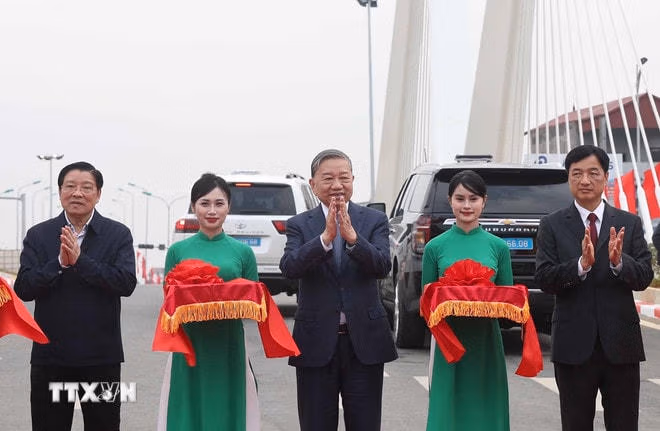 Sáng cùng ngày, Tổng Bí thư Tô Lâm và Đoàn công tác đã dự Lễ khánh thành tuyến đường Lê Duẩn và cầu sông Vân, thành phố Hoa Lư, tỉnh Ninh Bình.