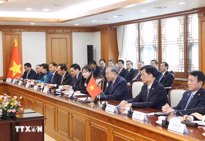 Theo đặc phái viên TTXVN, tiếp theo các hoạt động trong khuôn khổ chuyến thăm cấp Nhà nước tới Hàn Quốc, chiều 11/8, tại thủ đô Seoul, Tổng Bí thư Tô Lâm đã hội kiến Thủ tướng nước chủ nhà Kim Min Seok.