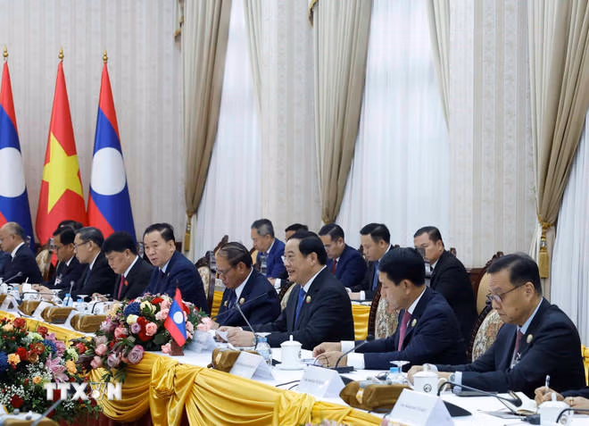 Tổng Bí thư đề nghị hai nước tiếp tục củng cố tin cậy chính trị, duy trì trao đổi đoàn, tiếp xúc cấp cao trên tất cả các kênh, tổ chức tốt Kỳ họp lần thứ 48 Ủy ban liên Chính phủ Việt Nam-Lào diễn ra ngay sau Cuộc gặp cấp cao hai Đảng vào ngày 2/12 để triển khai kết quả hội đàm cấp cao và những thỏa thuận cấp cao giữa hai nước, trong đó có gắn kết chiến lược, gắn kết chiến lược về tầm nhìn phát triển, gắn kết không gian và hạ tầng, các hành lang kinh tế, logistics, năng lượng, chuyển đổi xanh.