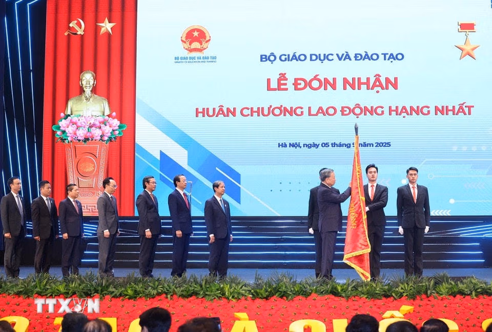 Nhân dịp này, thay mặt lãnh đạo Đảng, Nhà nước, Tổng Bí thư Tô Lâm đã trao tặng Huân chương Lao động hạng Nhất cho Bộ Giáo dục và Đào tạo vì đã có thành tích xuất sắc trong công tác quản lý Nhà nước về đào tạo, bồi dưỡng học sinh, sinh viên tài năng đạt giải cao trong các kỳ thi Olympic khu vực và quốc tế, góp phần nâng cao hiệu quả đào tạo nguồn nhân lực chất lượng cao phục vụ phát triển kinh tế-xã hội của đất nước giai đoạn 2023-2025./.
