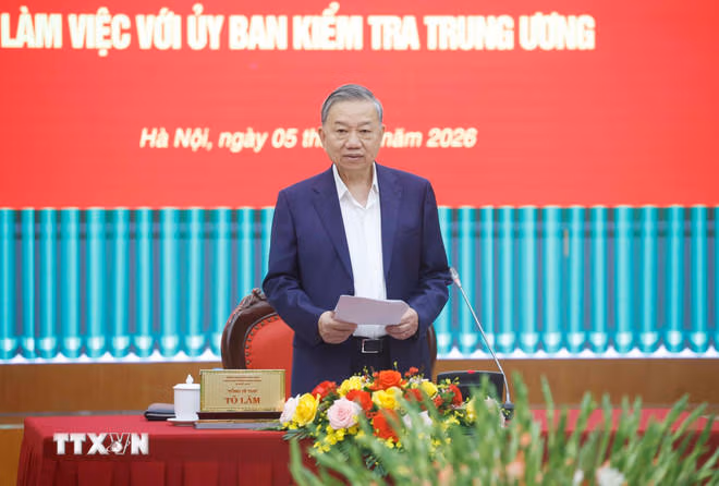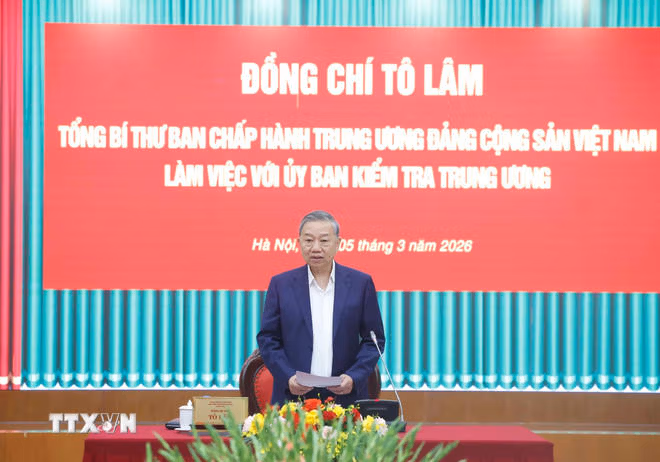 Tổng Bí thư Tô Lâm làm việc với Ủy ban kiểm tra Trung ương Thứ Năm 05/03/2026 20:19 (GMT+7) Chiều 5/3/2026, tại Hà Nội, Tổng Bí thư Tô Lâm làm việc với Ủy ban kiểm tra Trung ương. Tổng Bí thư Tô Lâm làm việc với Ủy ban kiểm tra Trung ương. (Ảnh: Thống Nhất/TTXVN).Tổng Bí thư Tô Lâm phát biểu. (Ảnh: Thống Nhất/TTXVN).Tổng Bí thư Tô Lâm phát biểu. (Ảnh: Thống Nhất/TTXVN).Tổng Bí thư Tô Lâm phát biểu. (Ảnh: Thống Nhất/TTXVN).Các đại biểu tham dự buổi làm việc. (Ảnh: Thống Nhất/TTXVN).Các đại biểu tham dự buổi làm việc. (Ảnh: Thống Nhất/TTXVN). TheoVietnam+ (VietnamPlus)