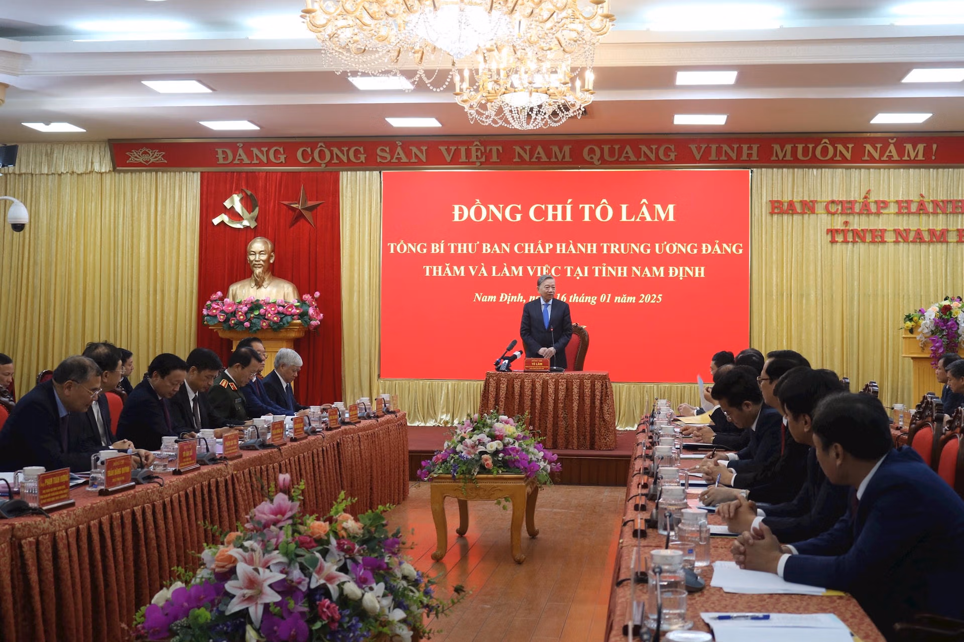 Làm việc với lãnh đạo chủ chốt của tỉnh Nam Định, Tổng Bí thư Tô Lâm bày tỏ vui mừng khi về thăm Nam Định-địa phương giàu truyền thống lịch sử, văn hóa, vùng đất “địa linh nhân kiệt”, quê hương, nơi phát tích của vương triều Trần, một trong những triều đại thịnh trị trong lịch sử phong kiến, cũng là quê hương của nhiều cán bộ lãnh đạo xuất sắc của Đảng.