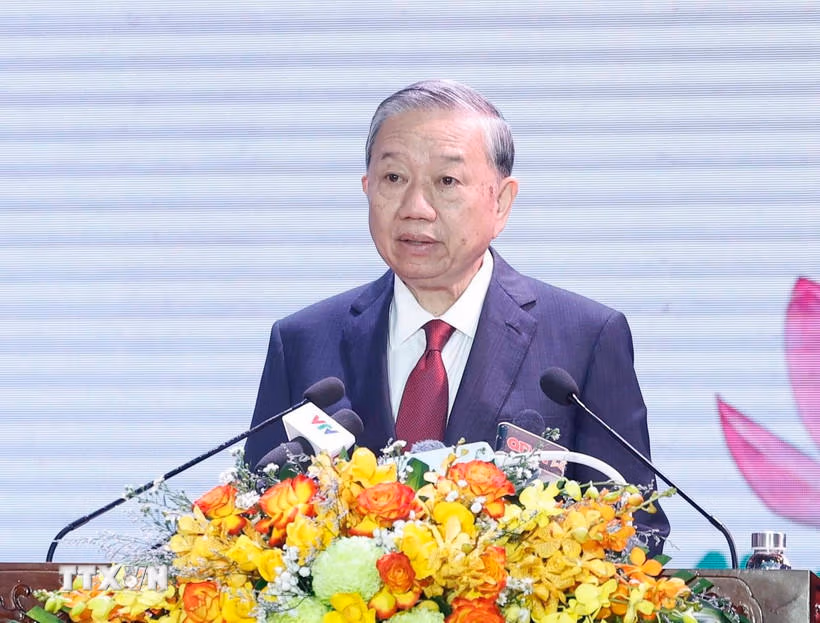 Tổng Bí thư Tô Lâm, Bí thư Quân ủy Trung ương dự và phát biểu chỉ đạo tại Lễ kỷ niệm.