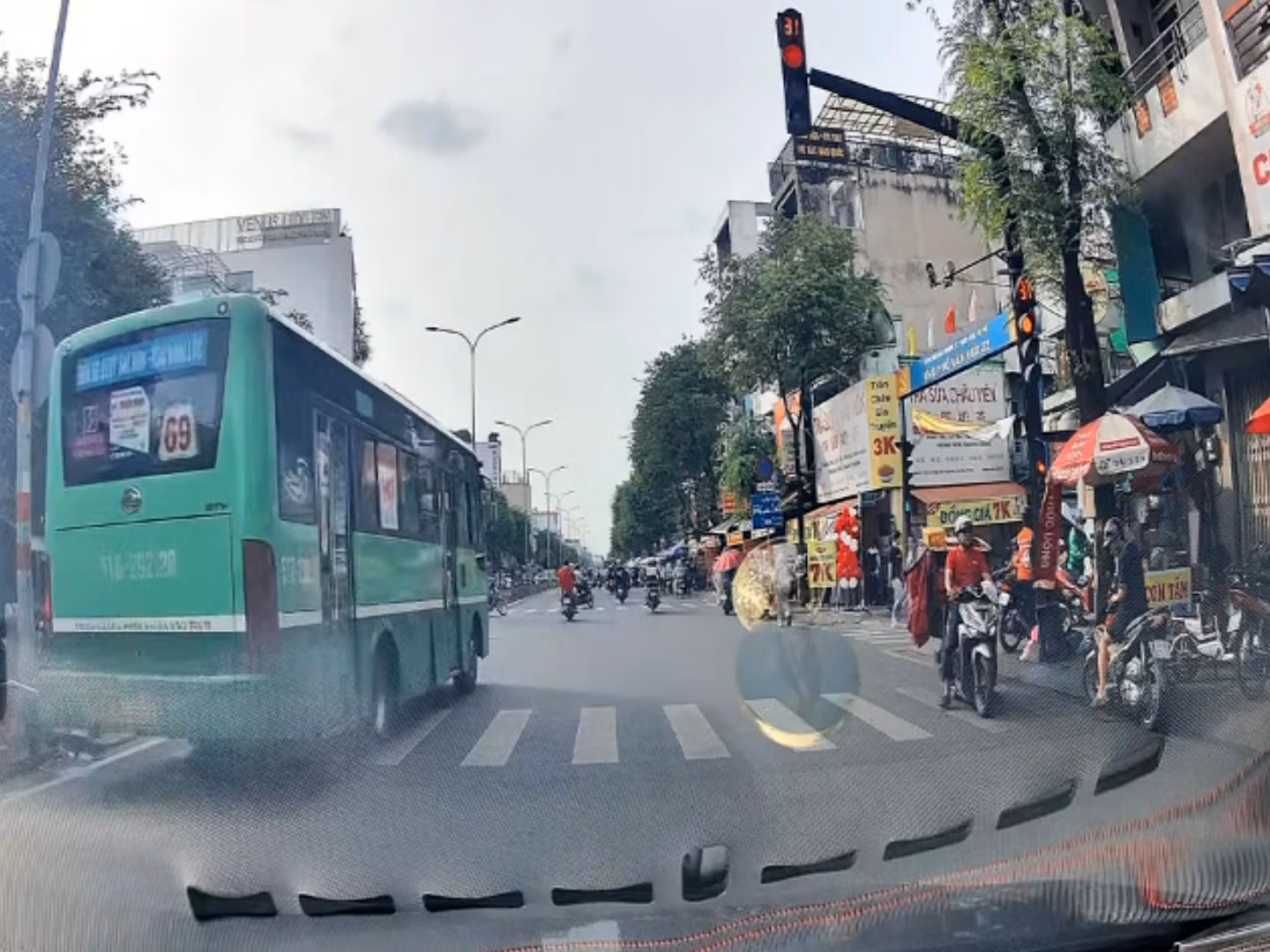 Mặc dù vẫn còn hơn 30 giây đèn đỏ và nhiều phương tiện đang dừng chờ nhưng chiếc xe bus chạy tuyến 69 vẫn băng nhanh qua, khiến nhiều người đi đường thót tim vì lo lắng.