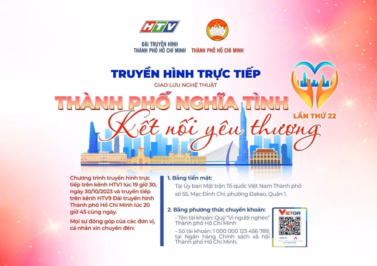 Chương trình giao lưu nghệ thuật “Thành phố nghĩa tình - Kết nối yêu thương” lần thứ 22, năm 2023, dự kiến được tổ chức vào lúc 19 giờ 30, ngày 30/10/2023 tại Nhà hát Đài truyền hình TP HCM (trực tiếp trên kênh HTV1 và truyền tiếp trên kênh HTV9, lúc 20 giờ 45 cùng ngày).